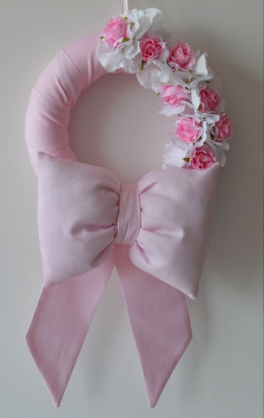 fiocco nascita mod.anastasia misure largo cm 25 x 50 alto e 12 di spessore composizione 100% cotone piquet impreziosito con rose ed ortensie