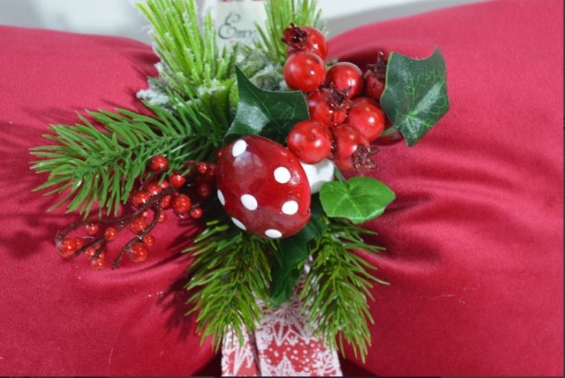 FIOCCO IMBOTTITO NATALIZIO COMPOSIZIONE 65%POLIESTERE 35% COTONE TESSUTO IN VELLUTO COLORE ROSSO ADORNATO CON COMPOSIZIONE NATALIZIE MISURA LARGO CM 26X45 ALTO