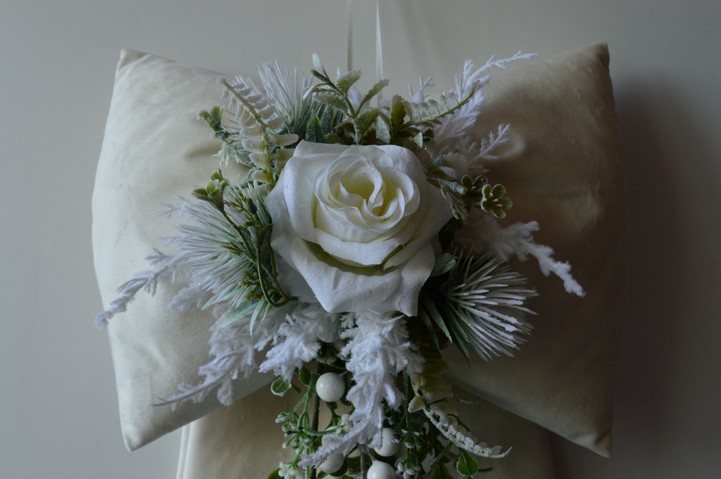 FIOCCO IMBOTTITO ARTIGIANALE ?CON ADDOBBI NATALIZI COMPOSIZIONE 65%POLIESTERE 35% COTONE TESSUTO IN VELLUTINO COLORE AVORIO ADORNATO CON COMPOSIZIONE NATALIZIE MISURA LARGO CM 30X50 ALTO