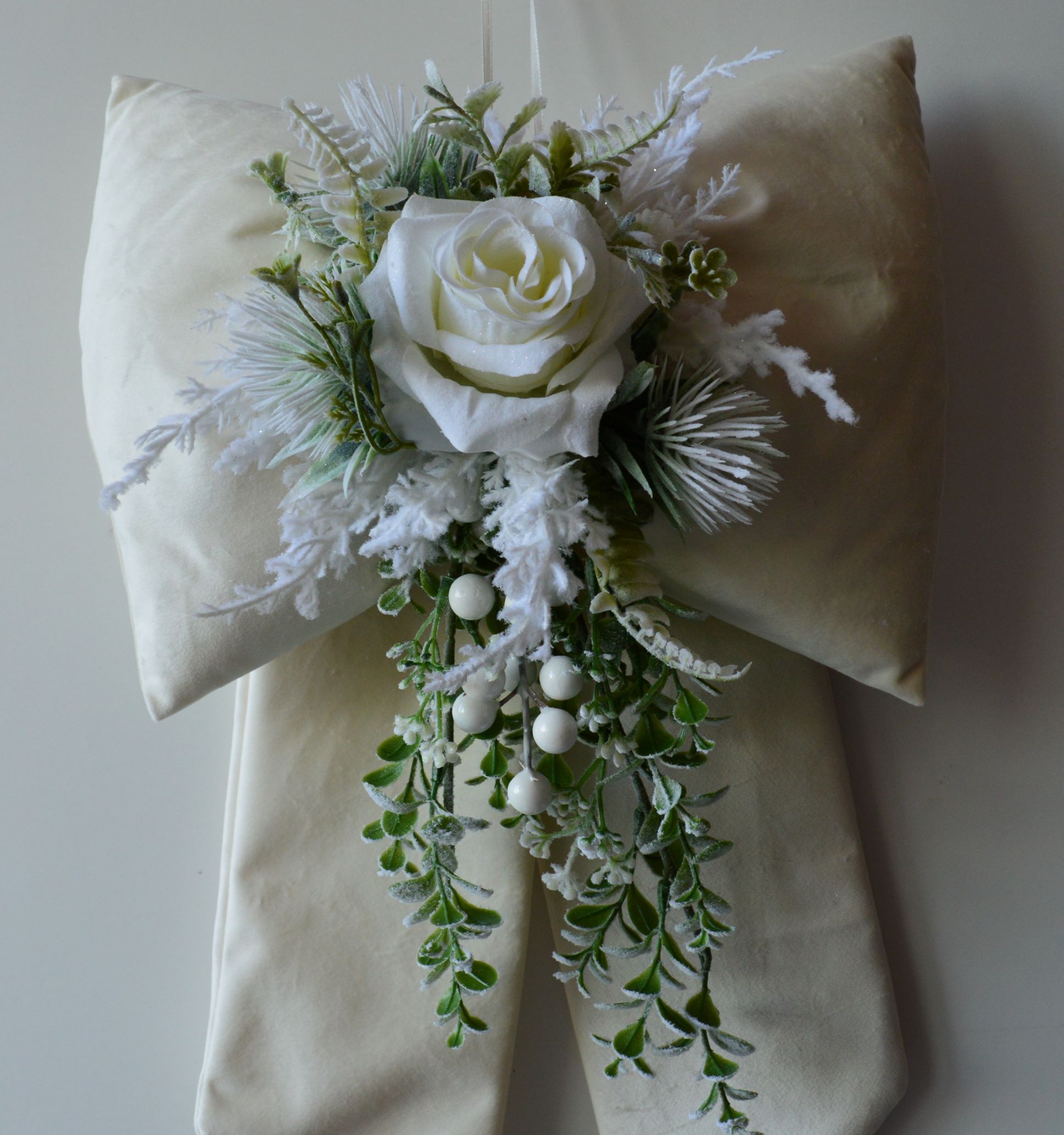 FIOCCO IMBOTTITO ARTIGIANALE ?CON ADDOBBI NATALIZI COMPOSIZIONE 65%POLIESTERE 35% COTONE TESSUTO IN VELLUTINO COLORE AVORIO ADORNATO CON COMPOSIZIONE NATALIZIE MISURA LARGO CM 30X50 ALTO