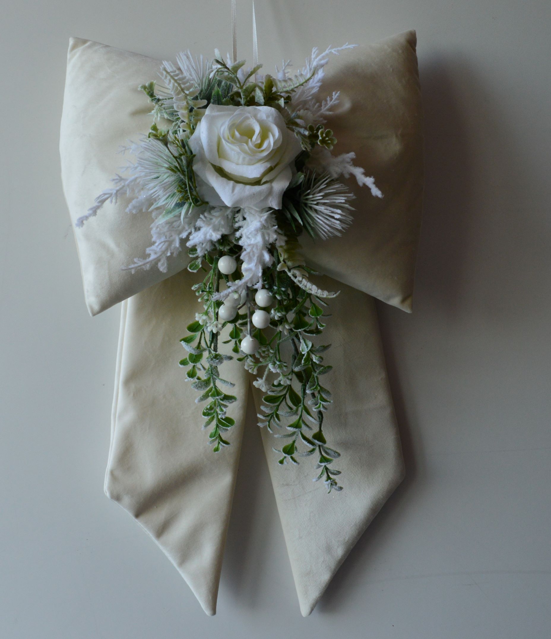 FIOCCO IMBOTTITO ARTIGIANALE ?CON ADDOBBI NATALIZI COMPOSIZIONE 65%POLIESTERE 35% COTONE TESSUTO IN VELLUTINO COLORE AVORIO ADORNATO CON COMPOSIZIONE NATALIZIE MISURA LARGO CM 30X50 ALTO