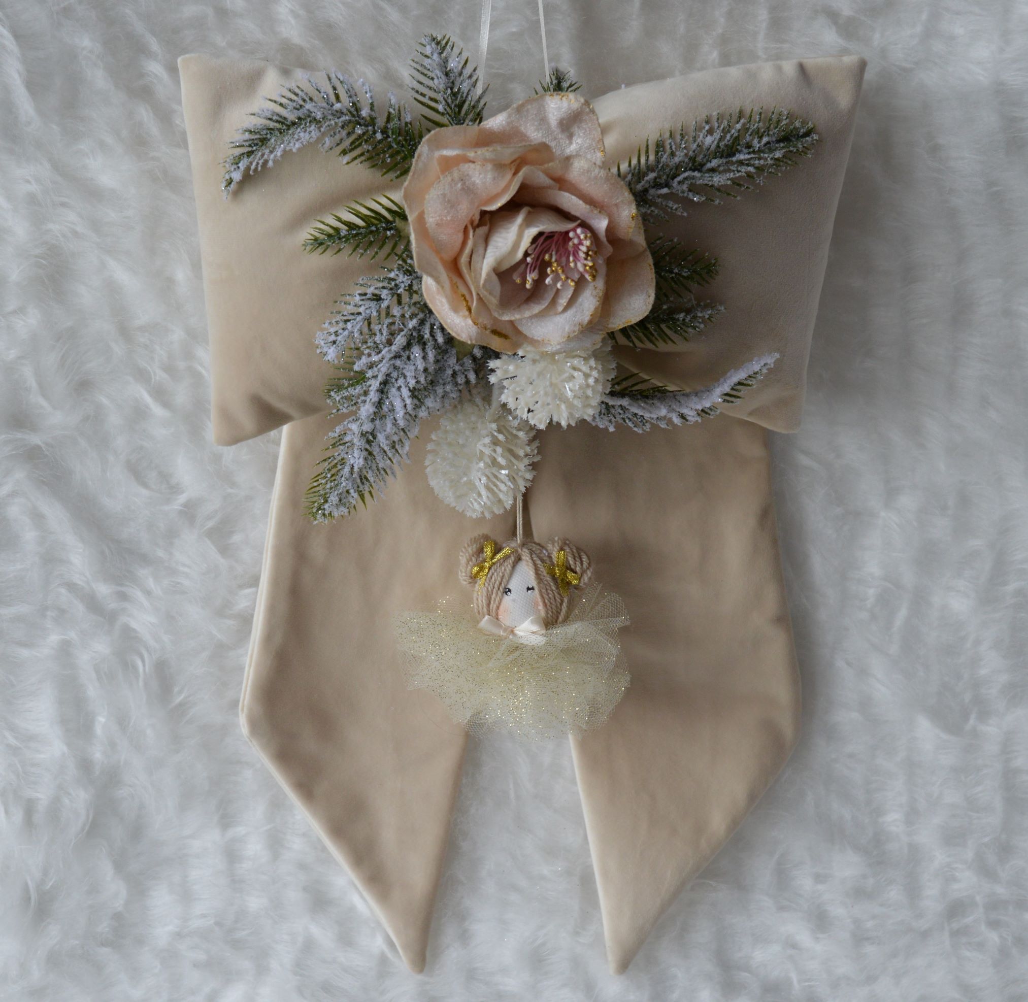 FIOCCO IMBOTTITO NATALIZIO ART NAIA COMPOSIZIONE 65%POLIESTERE 35% COTONE TESSUTO IN VELLUTINO COLORE BEIGE ADORNATO CON COMPOSIZIONE NATALIZIE MISURA LARGO CM 28X45 ALTO