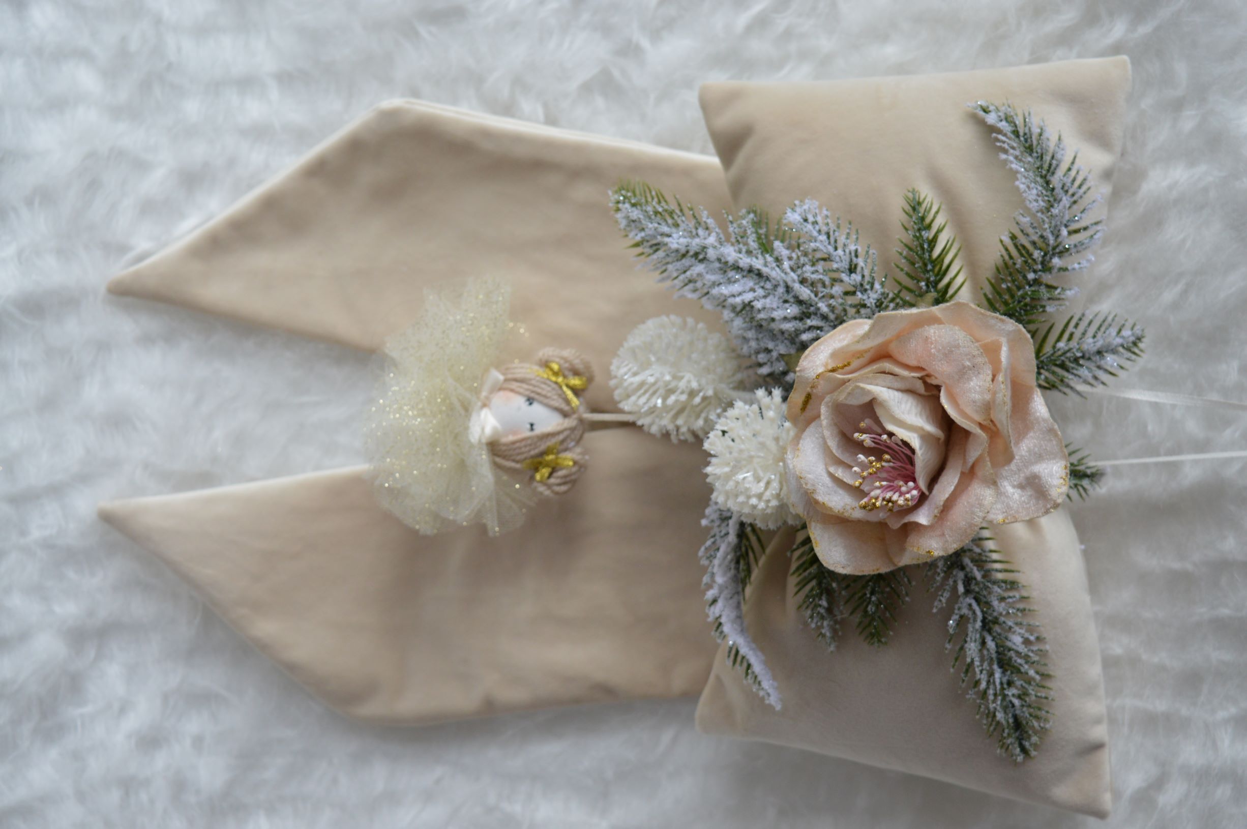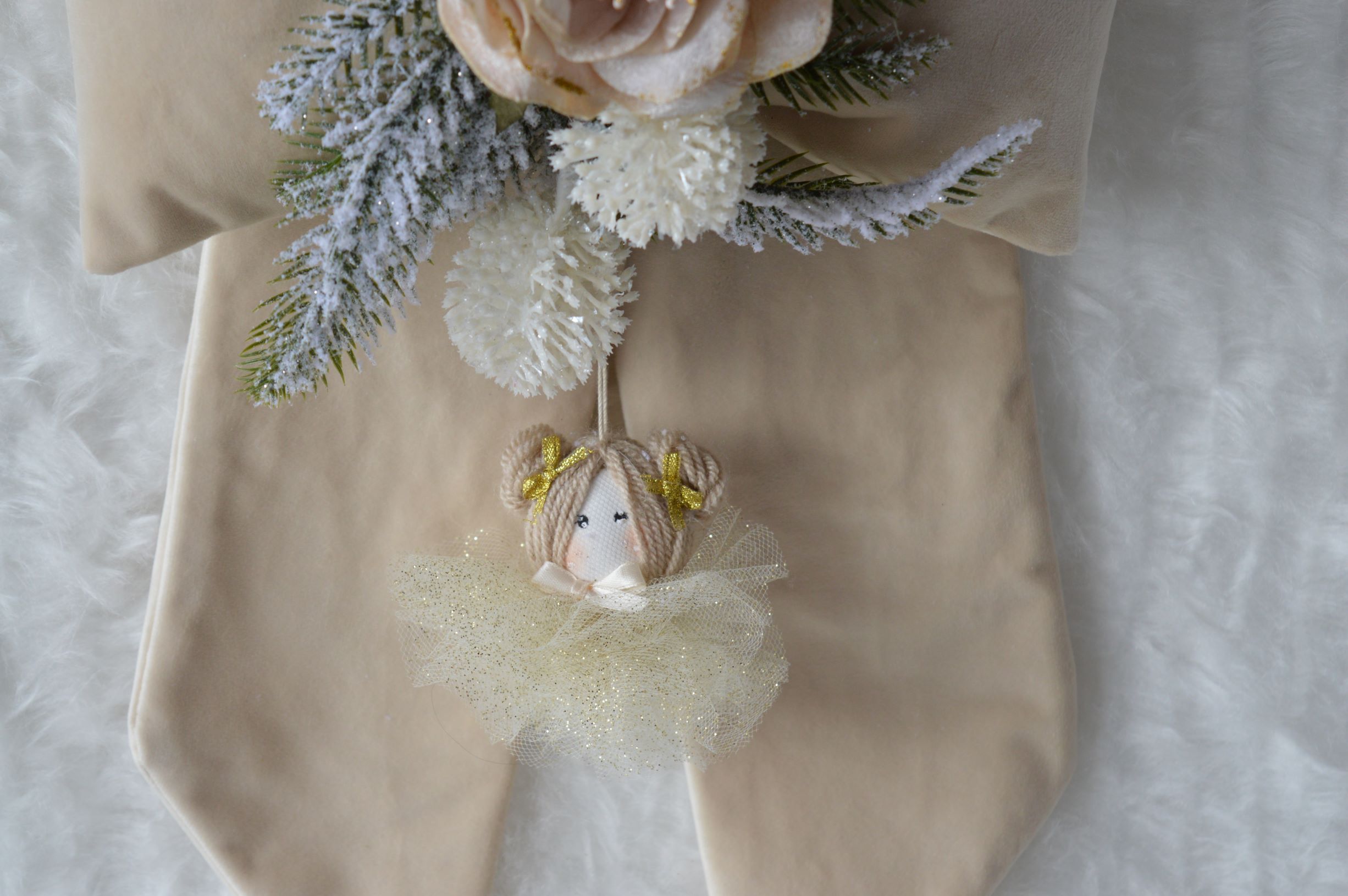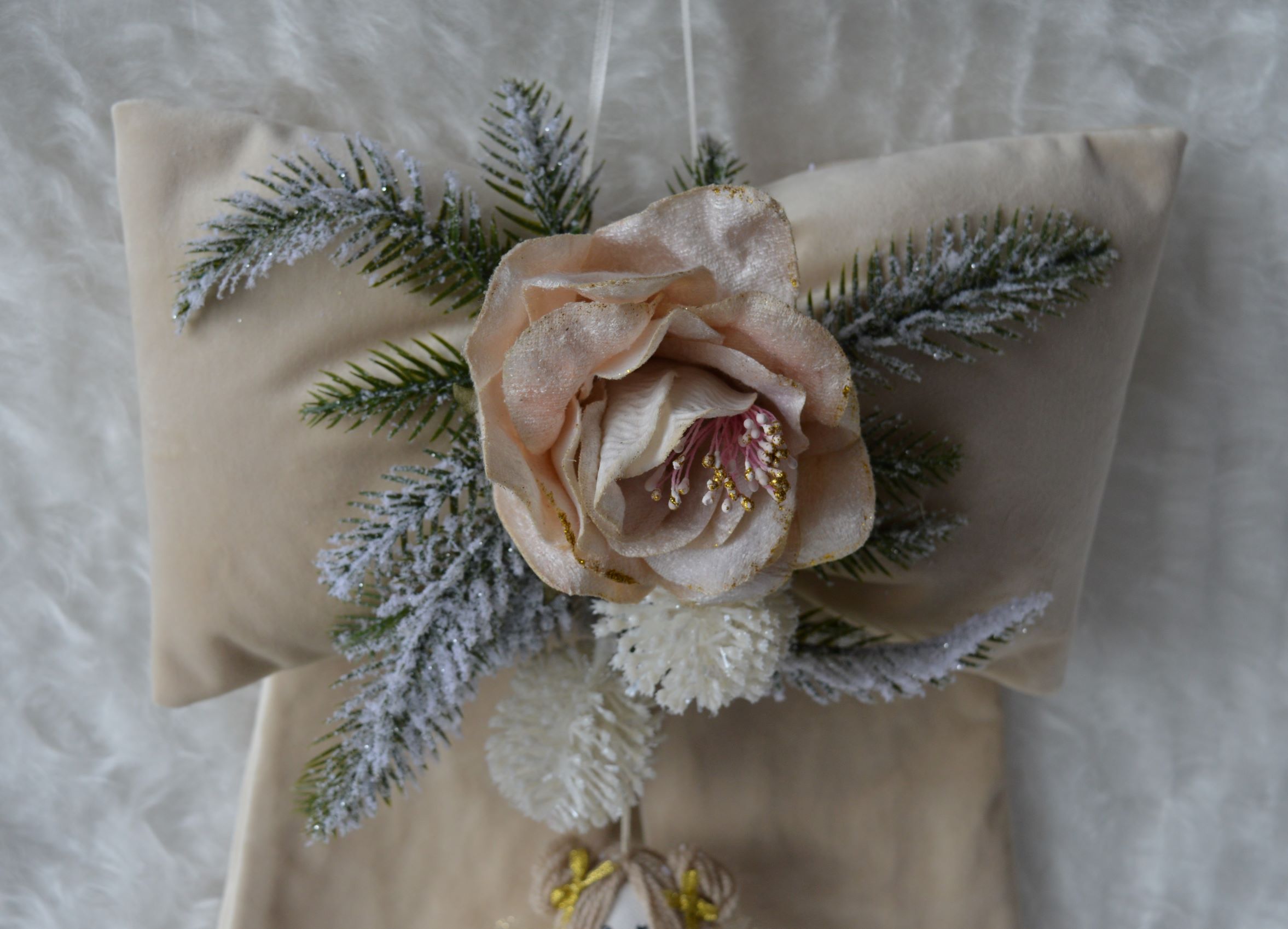 FIOCCO IMBOTTITO NATALIZIO ART NAIA COMPOSIZIONE 65%POLIESTERE 35% COTONE TESSUTO IN VELLUTINO COLORE BEIGE ADORNATO CON COMPOSIZIONE NATALIZIE MISURA LARGO CM 28X45 ALTO