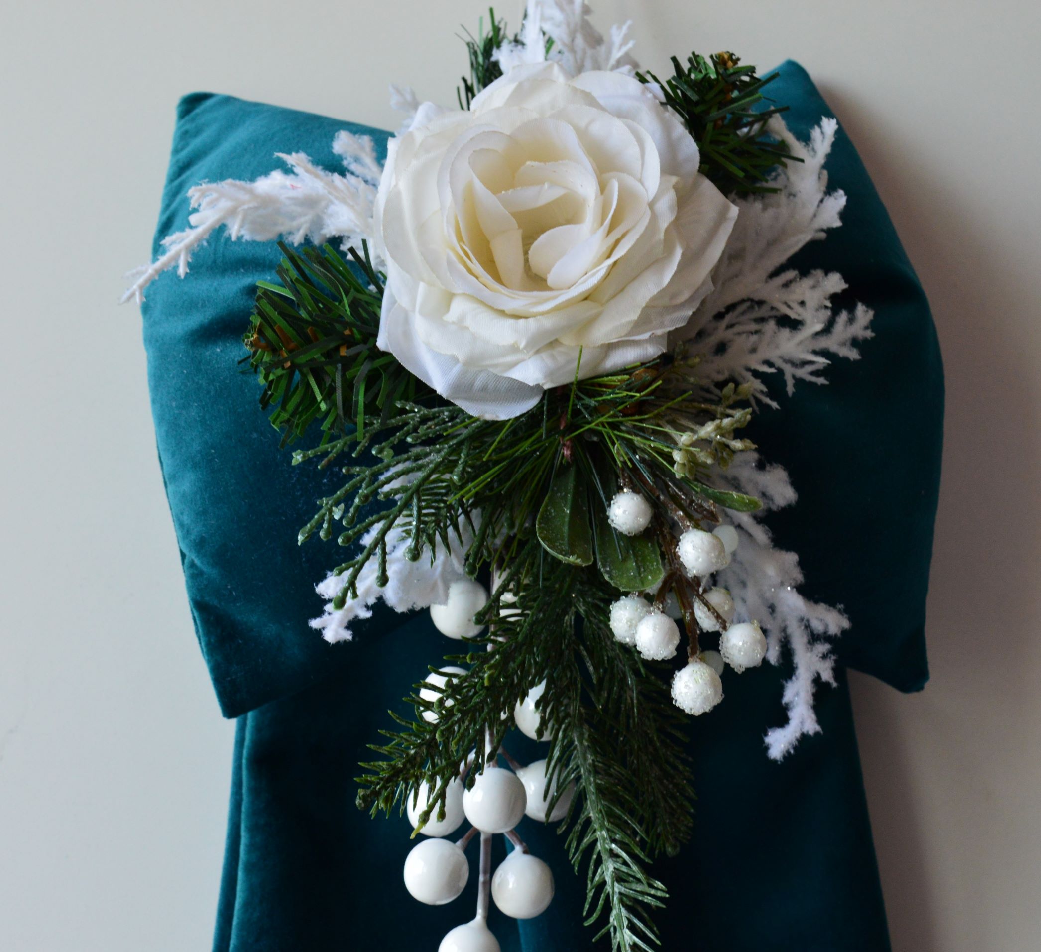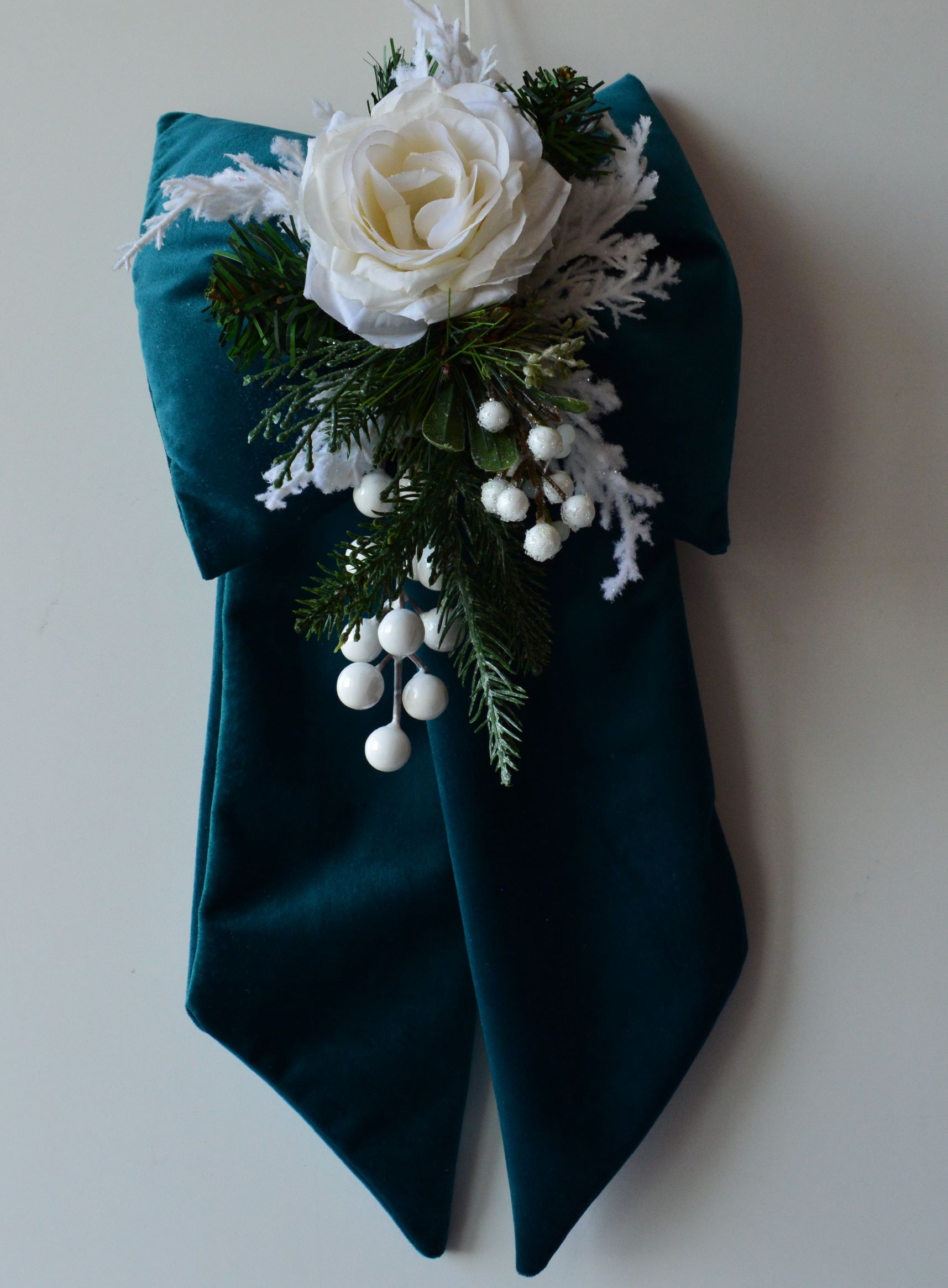 FIOCCO IMBOTTITO ARTIGIANALE CON ADDOBBI NATALIZI COMPOSIZIONE 65%POLIESTERE 35% COTONE TESSUTO IN VELLUTINO COLORE VERDE BOSCO ADORNATO CON COMPOSIZIONE NATALIZIE MISURA LARGO CM 21X45 ALTO