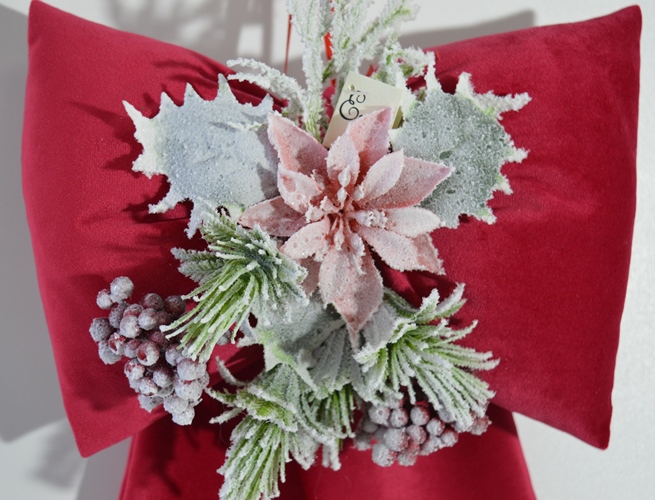 FIOCCO IMBOTTITO NATALIZIO ART PELAGIA COMPOSIZIONE 65%POLIESTERE 35% COTONE TESSUTO IN VELLUTO COLORE ROSSO PORPORA ADORNATO CON COMPOSIZIONE NATALIZIE MISURA LARGO CM 26X45 ALTO