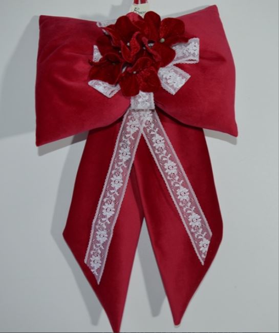 FIOCCO IMBOTTITO NATALIZIO ART ELECTRE COMPOSIZIONE 65%POLIESTERE 35% COTONE TESSUTO IN VELLUTO COLORE ROSSO E PIZZO BIANCO ADORNATO CON COMPOSIZIONE NATALIZIE MISURA LARGO CM 26X45 ALTO