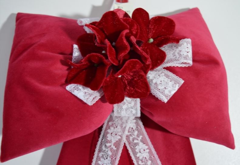 FIOCCO IMBOTTITO NATALIZIO ART ELECTRE COMPOSIZIONE 65%POLIESTERE 35% COTONE TESSUTO IN VELLUTO COLORE ROSSO E PIZZO BIANCO ADORNATO CON COMPOSIZIONE NATALIZIE MISURA LARGO CM 26X45 ALTO