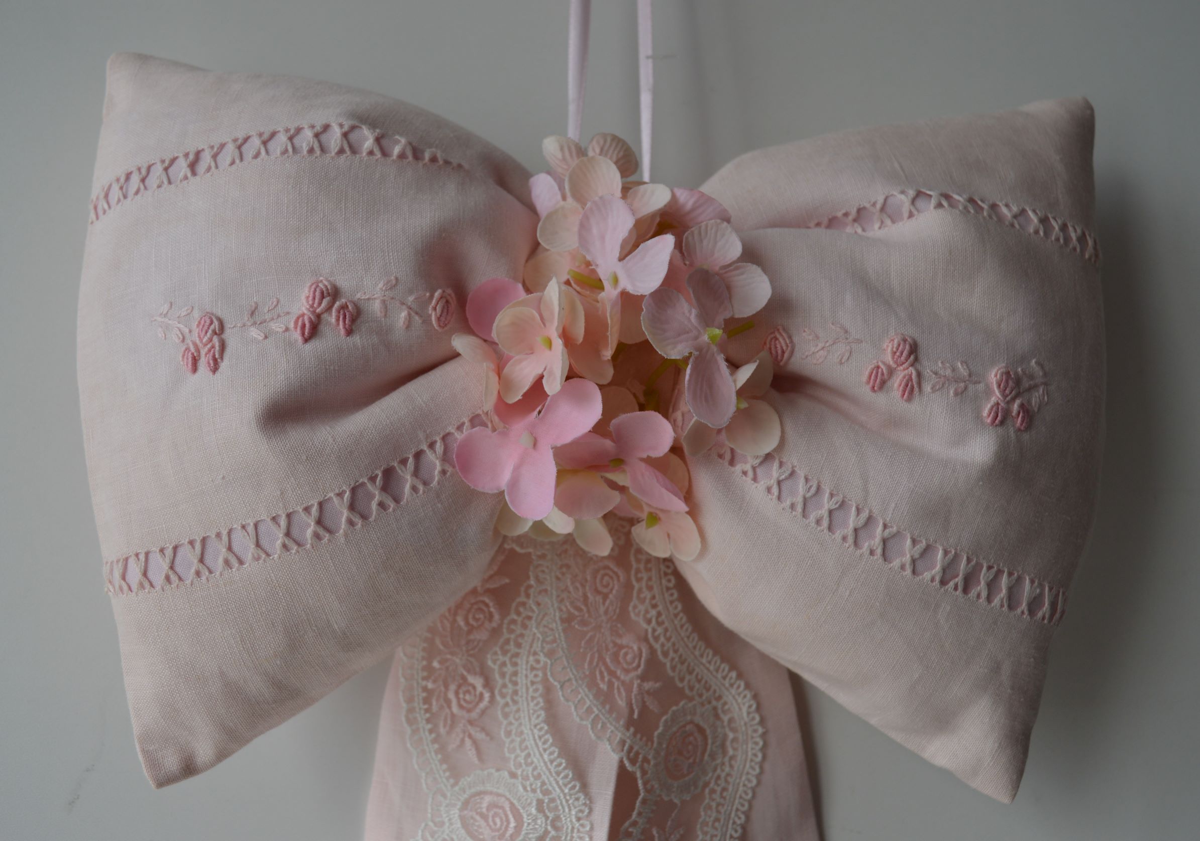 fiocco artigianale di Emy ricami composizione 100% puro lino con ricami fatti a mano imbottitura 100% poliestere colore rosa mis cm 28x 45 è possibile su richiesta personalizzare il fiocco contattando i nostri info