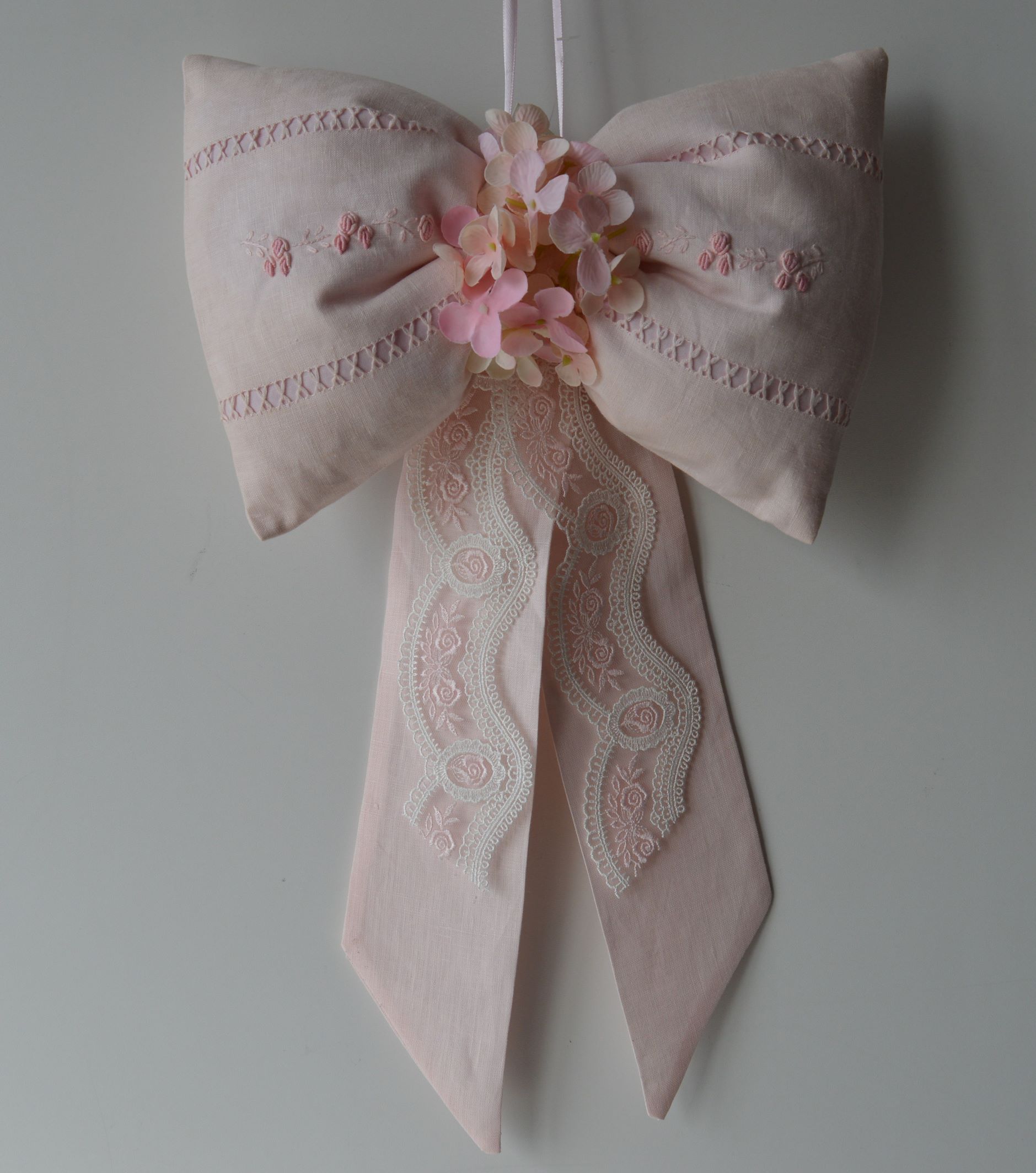 fiocco artigianale di Emy ricami composizione 100% puro lino con ricami fatti a mano imbottitura 100% poliestere colore rosa mis cm 28x 45 è possibile su richiesta personalizzare il fiocco contattando i nostri info