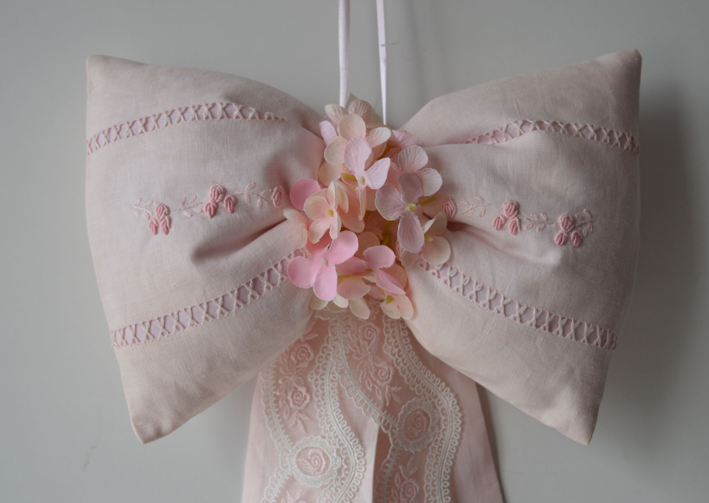fiocco artigianale di Emy ricami composizione 100% puro lino con ricami fatti a mano imbottitura 100% poliestere colore rosa mis cm 28x 45 è possibile su richiesta personalizzare il fiocco contattando i nostri info
