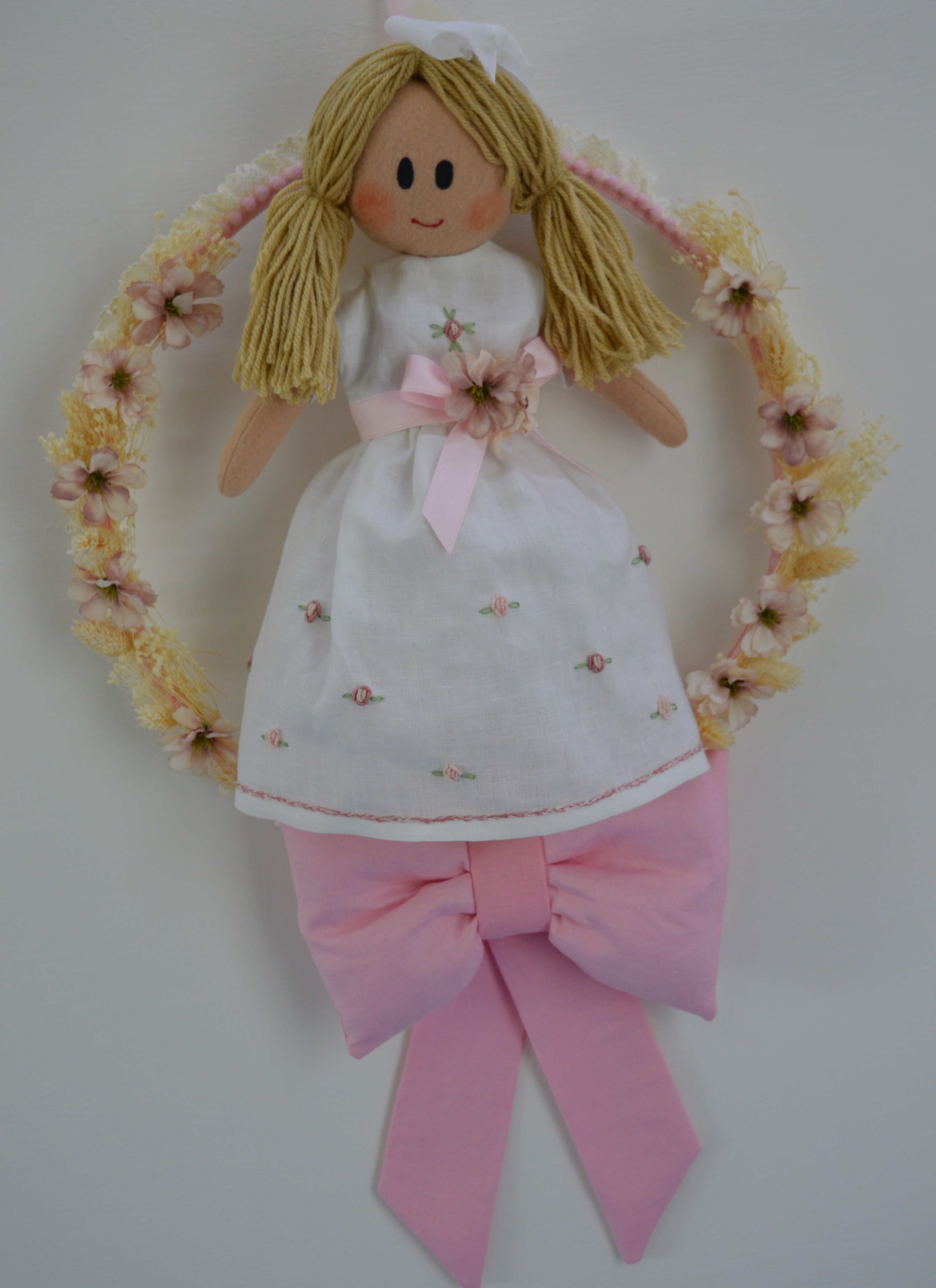 Fiocco nascita con bambola artigianale di Emy ricami mis cm 35x60 art Mara
