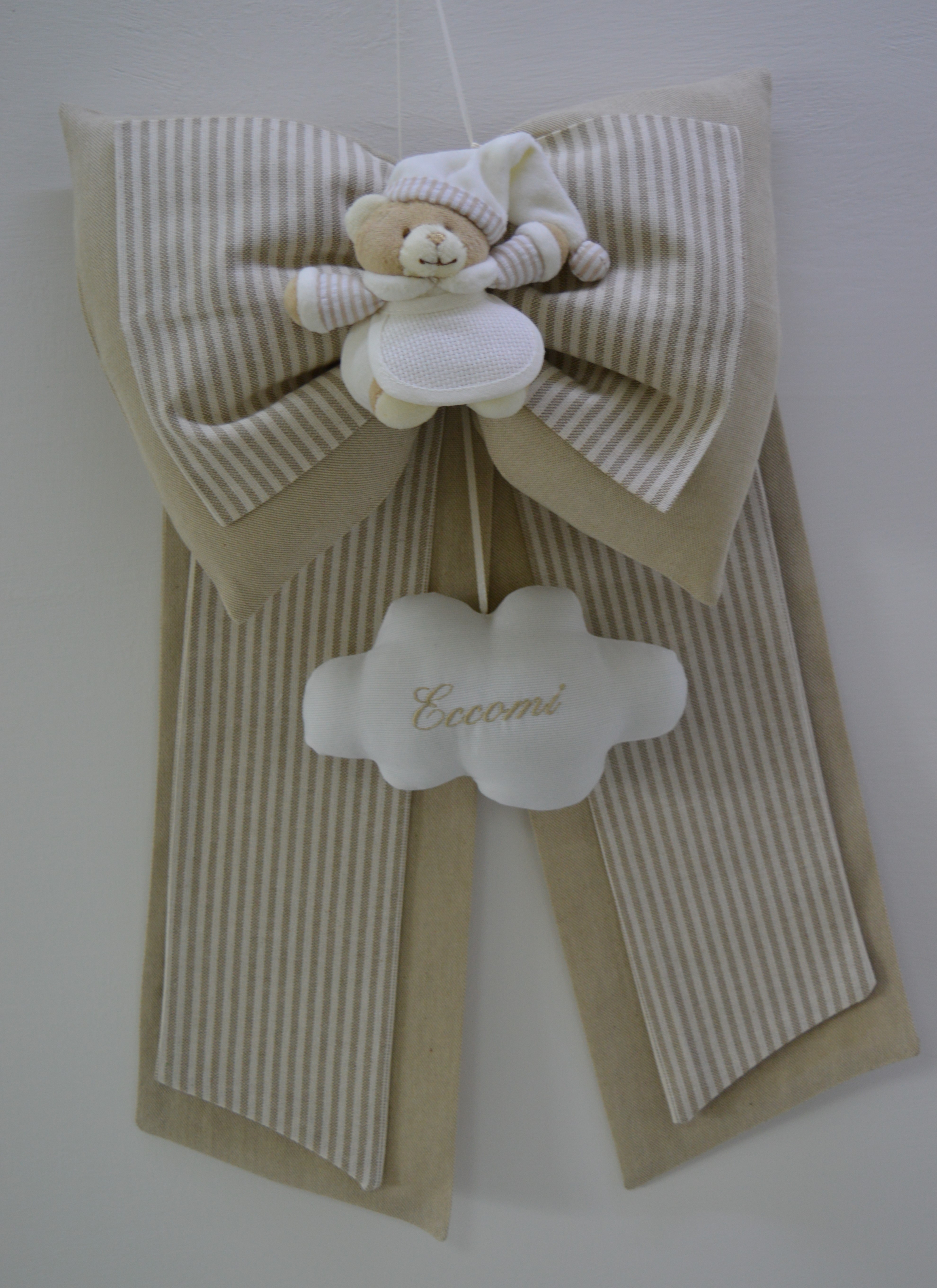 Fiocco nascita di Emy ricami composizione 65% cotone 35% poliestere imbottitura 100% poliestere accessorio 100% cotone piquet con scritta Eccomi orsetto 100% poliestere colore lino e bianco misura cm 35x50 lavorazione artigianale su richiesta è possibile personalizzarlo contattando i nostri info.