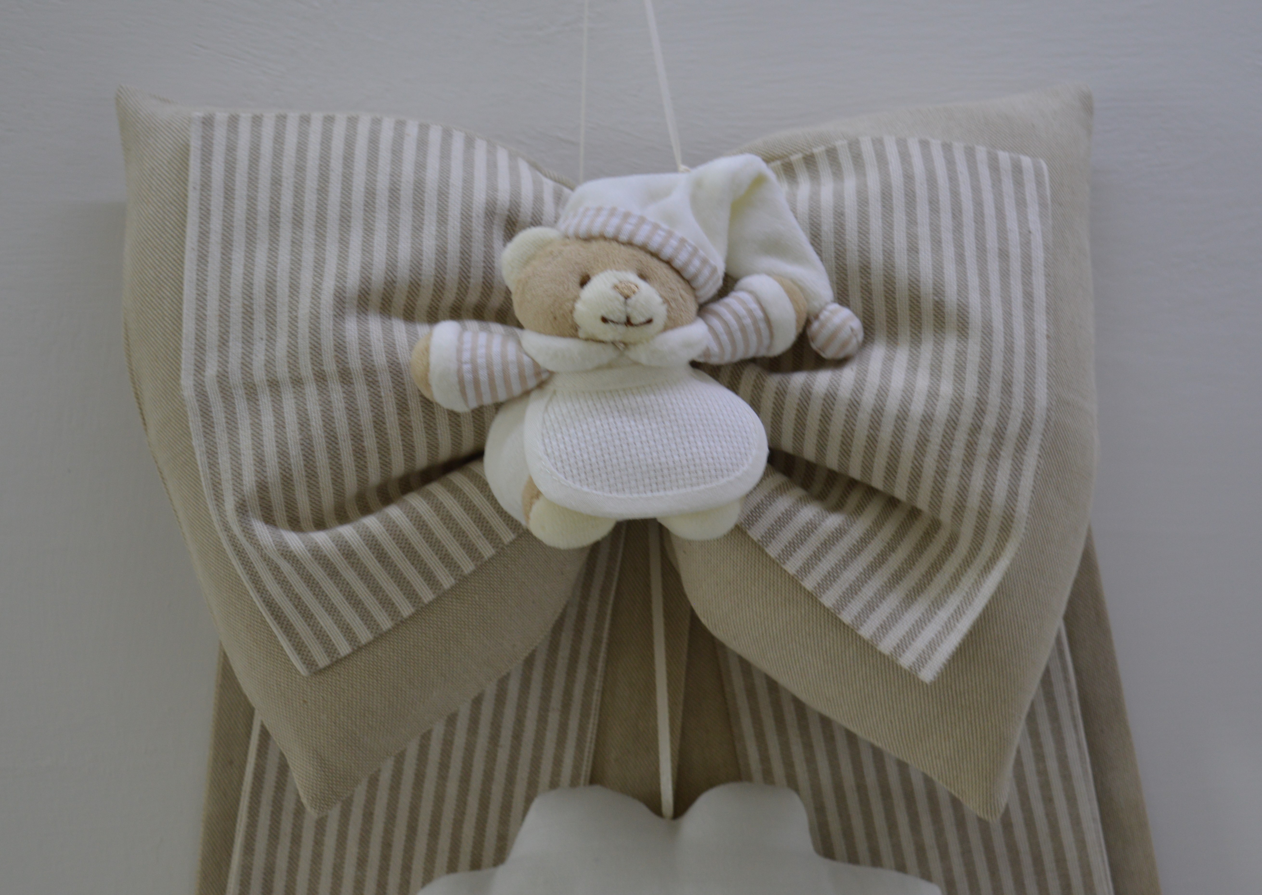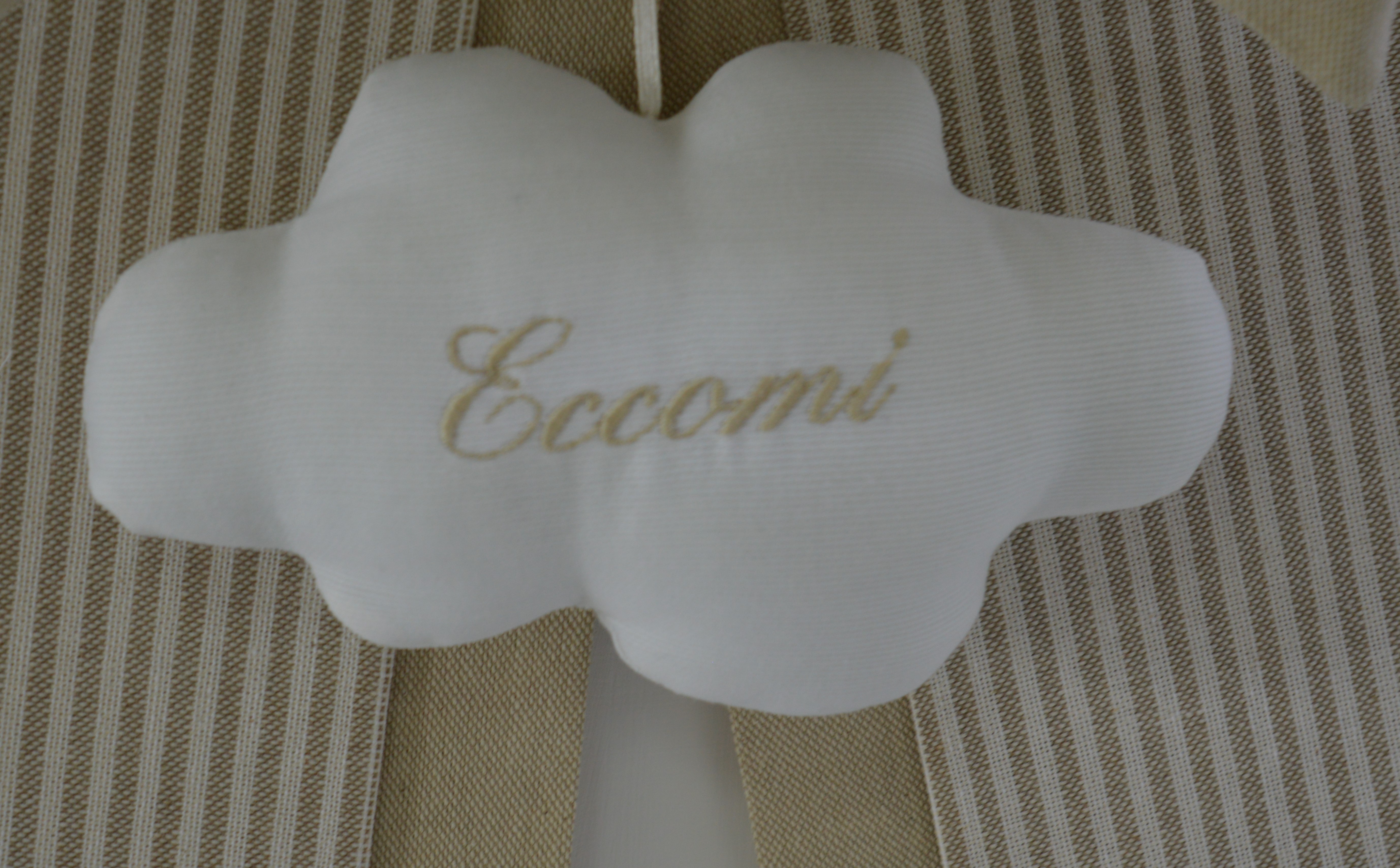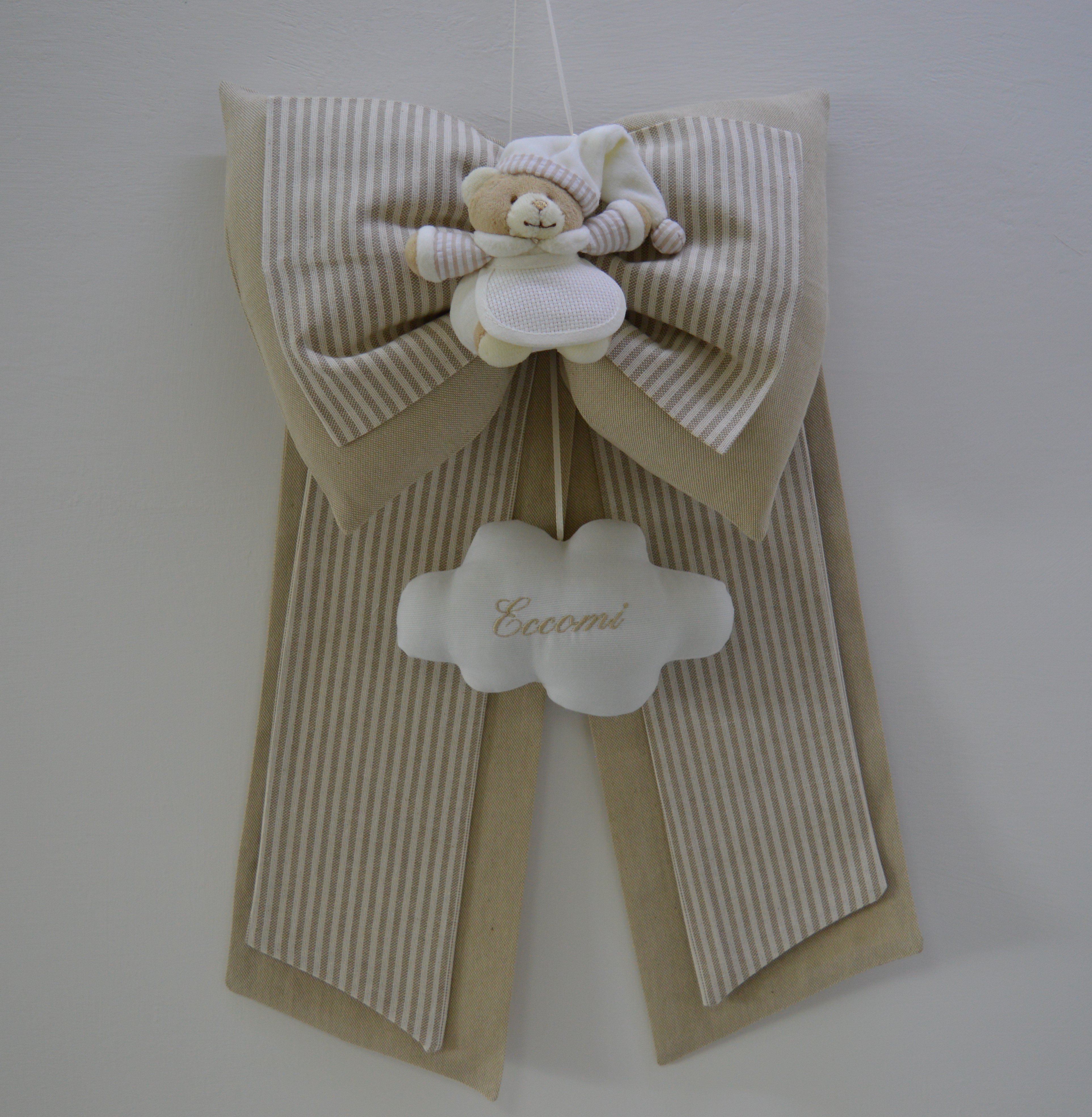 Fiocco nascita di Emy ricami composizione 65% cotone 35% poliestere imbottitura 100% poliestere accessorio 100% cotone piquet con scritta Eccomi orsetto 100% poliestere colore lino e bianco misura cm 35x50 lavorazione artigianale su richiesta è possibile personalizzarlo contattando i nostri info.