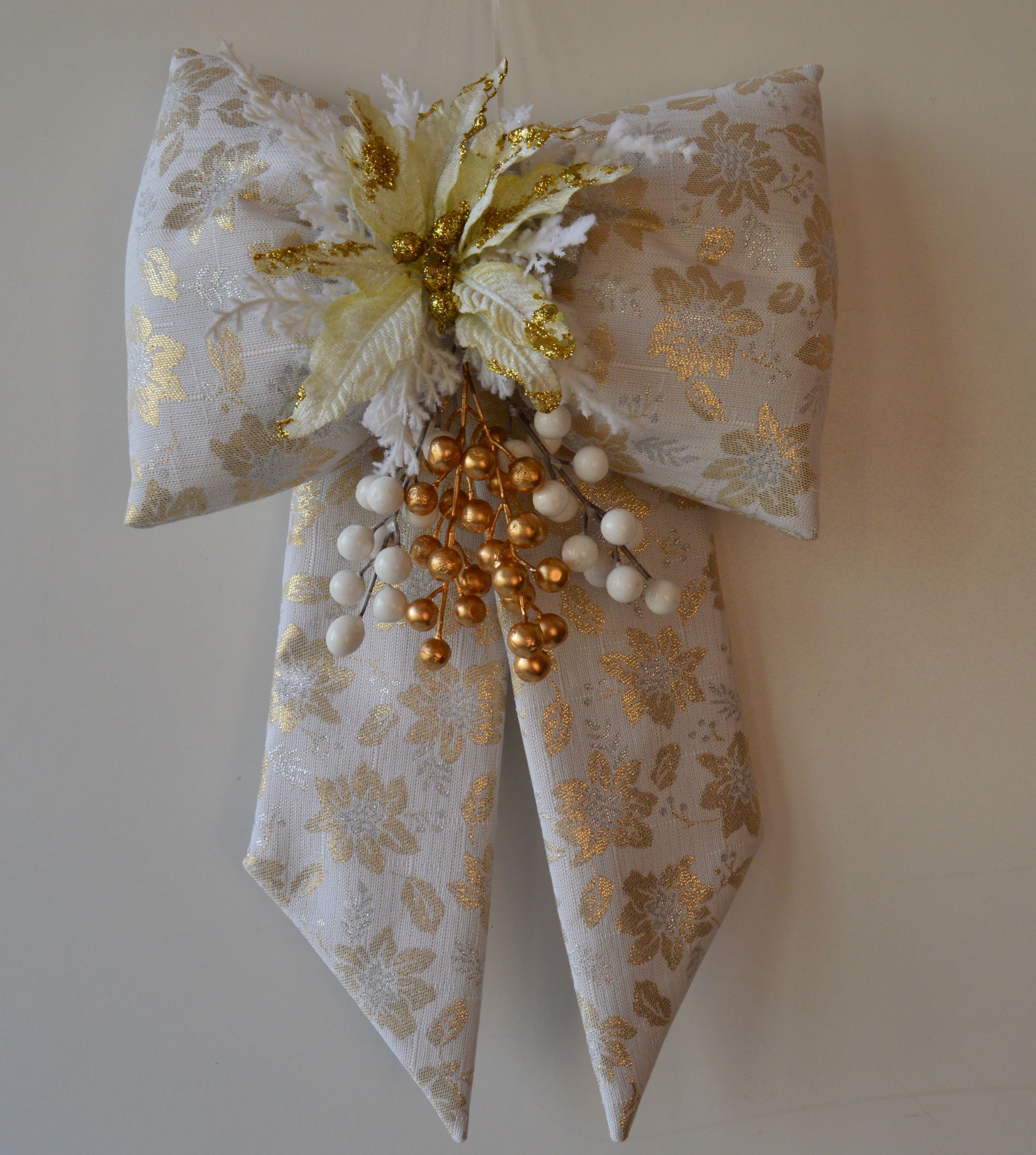fiocco natalizio artigianale di Emy ricami com.65% poliestere 10% lurex 25% algodon colore avorio e oro con addobbi natalizi misura cm 30x50