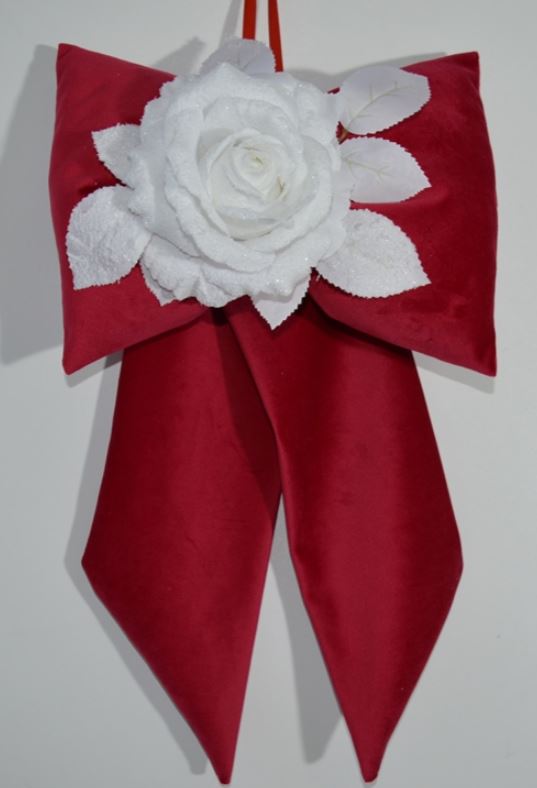 FIOCCO IMBOTTITO NATALIZIO COMPOSIZIONE 65%POLIESTERE 35% COTONE TESSUTO IN VELLUTO COLORE ROSSO ADORNATO CON COMPOSIZIONE NATALIZIE MISURA LARGO CM 26X45 ALTO