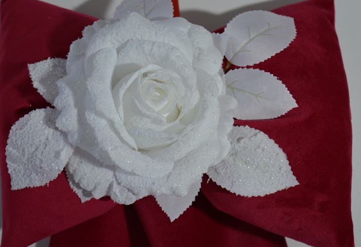FIOCCO IMBOTTITO NATALIZIO COMPOSIZIONE 65%POLIESTERE 35% COTONE TESSUTO IN VELLUTO COLORE ROSSO ADORNATO CON COMPOSIZIONE NATALIZIE MISURA LARGO CM 26X45 ALTO