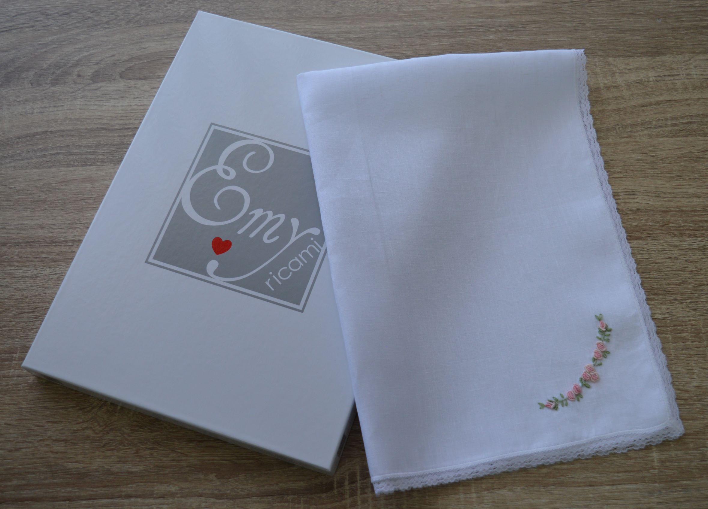 mussola per nascita con pizzo e ricami a mano di Emy Ricami misura cm 50x70 composizione 100% lino colore lino bianco e ricami rosa confezionata in una elegantissima scatola personalizzata Emy Ricami su richiesta possibilta di personalizzazzione