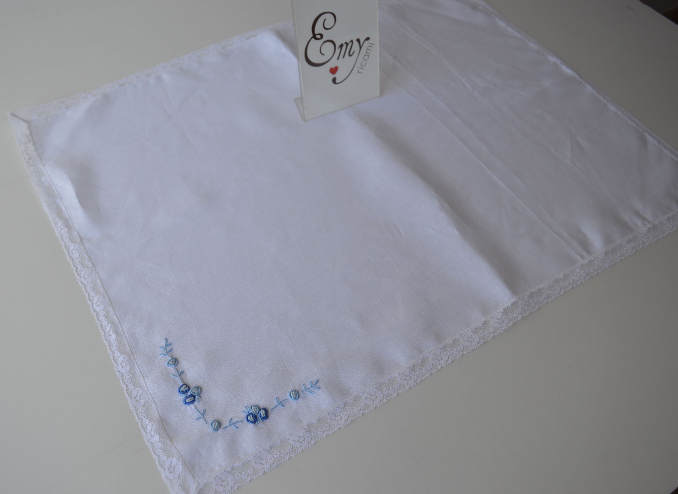 quadrato per nascita con ricami a mano punto vapore misura cm 70x50 composizione 100% lino rifinito con pizzo valencienne colore bianco con ricami bicolore celeste e blu su richiesta è possibile personalizzare il prodotto contattare i nostri info