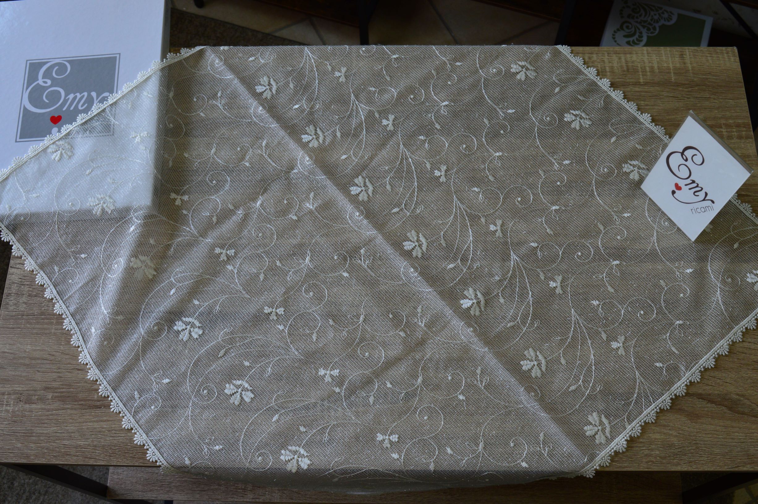 offerta centrotavola quadrato in tulle ricamato comp.100% poliestere mis cm 80x80 colore avorio confezionato in una elegante scatola personalizzata emy ricami