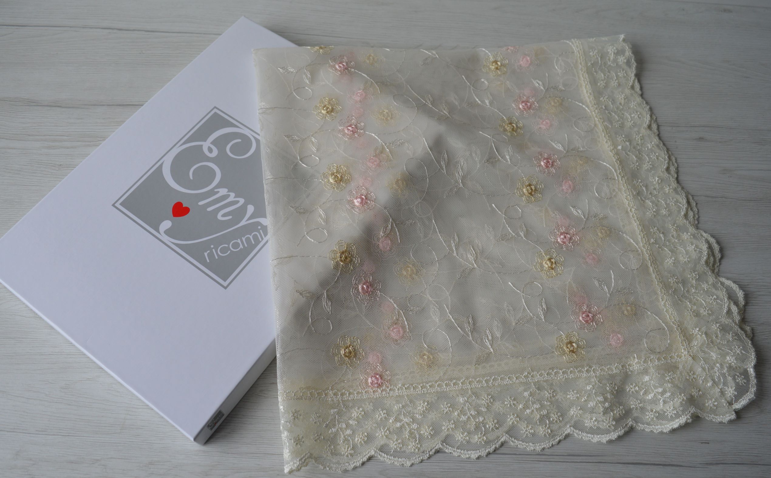 centro tavola quatrato in tulle ricamato mis cm 80x80 colore avorio e rosa composizione 100% poliestere prodotto artigianale di Emy ricami confezionato in una elegantissima scatola personalizzata Emy ricami