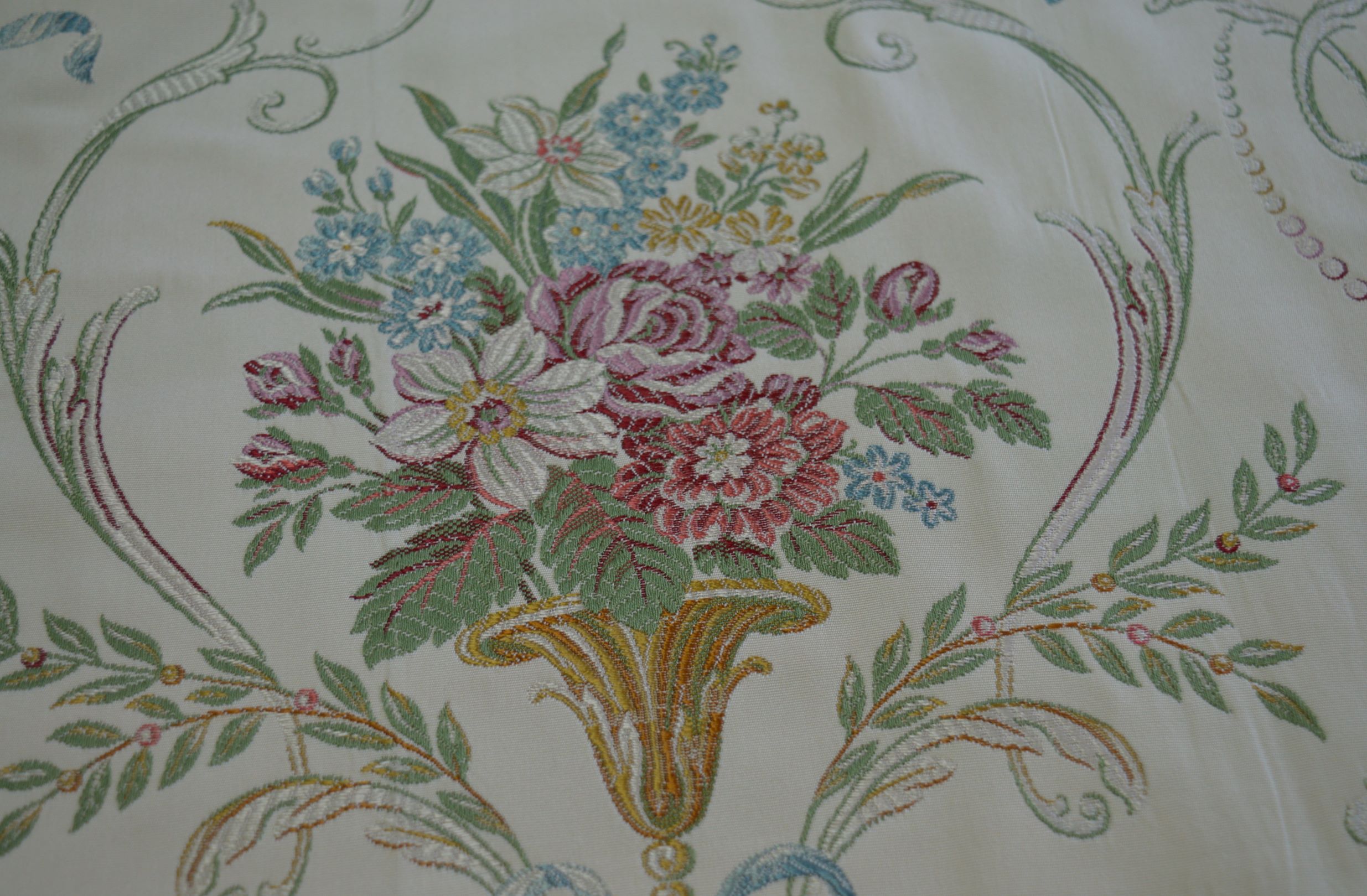 centrotavola quadrato mis cm 75x75 composizione 35% poliestere 65% cotone fondo beige e fantasia multicolore rifinito con passamaneria a cipollina in verde