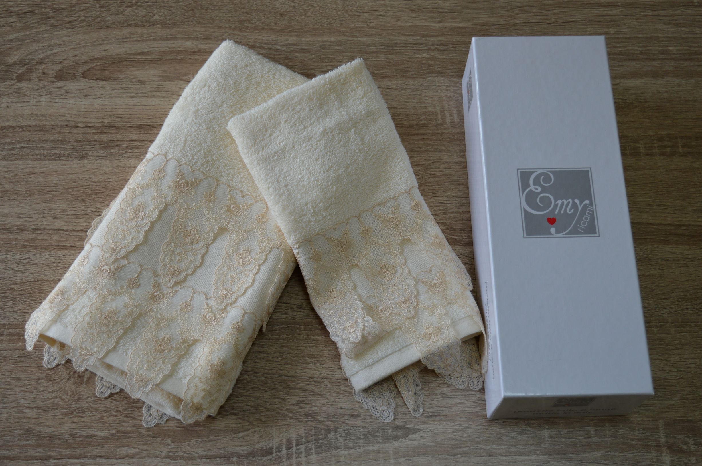 OFFERTA COPPIA ASCIUGAMANI SPUGNA E TULLE RICAMATO DI EMY RICAMI COL AVORIO ART OSAKA