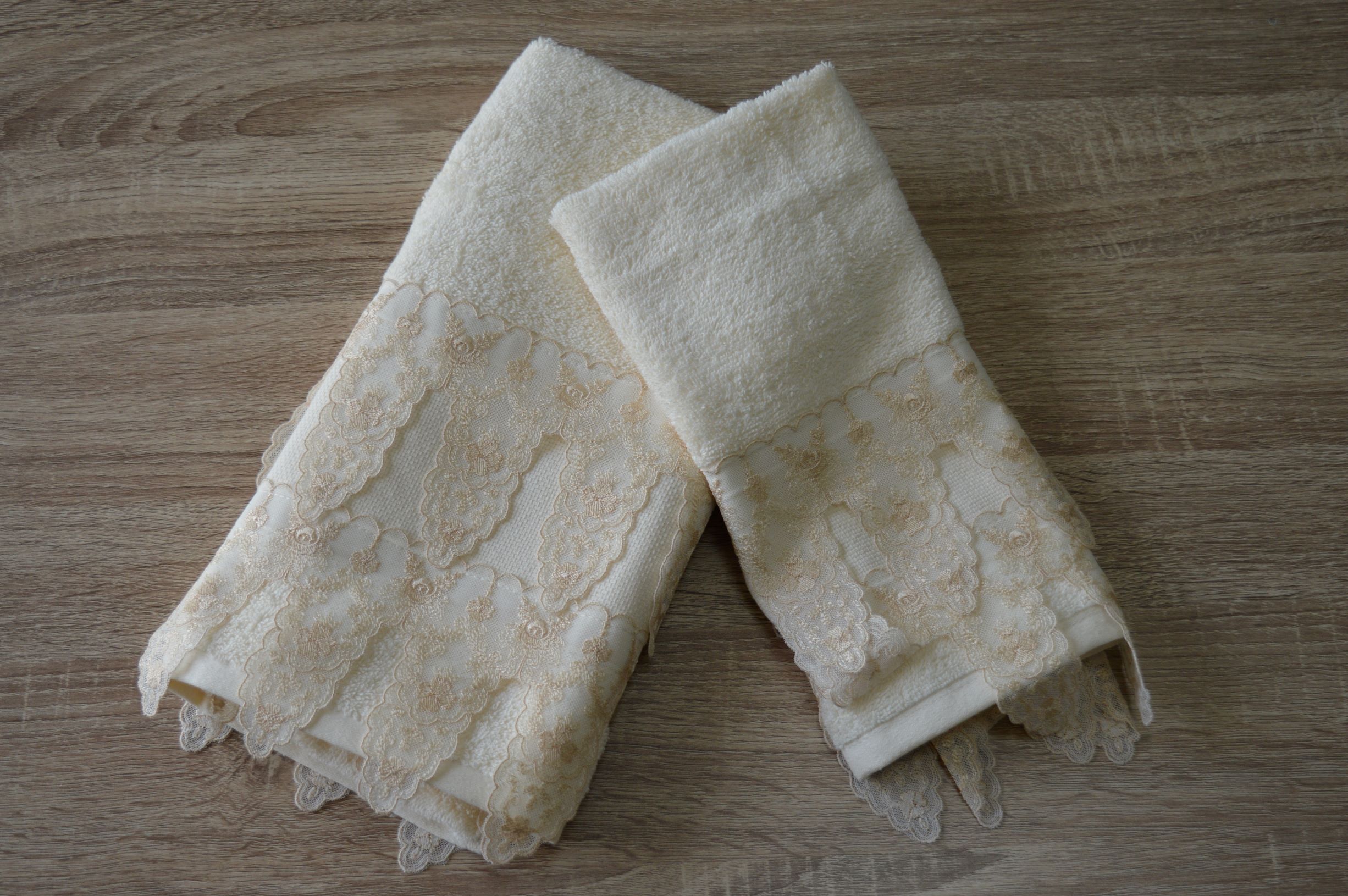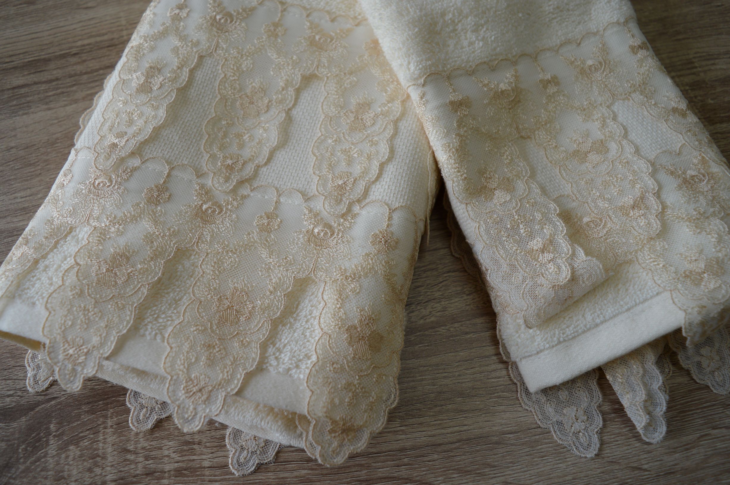 OFFERTA COPPIA ASCIUGAMANI SPUGNA E TULLE RICAMATO DI EMY RICAMI COL AVORIO ART OSAKA
