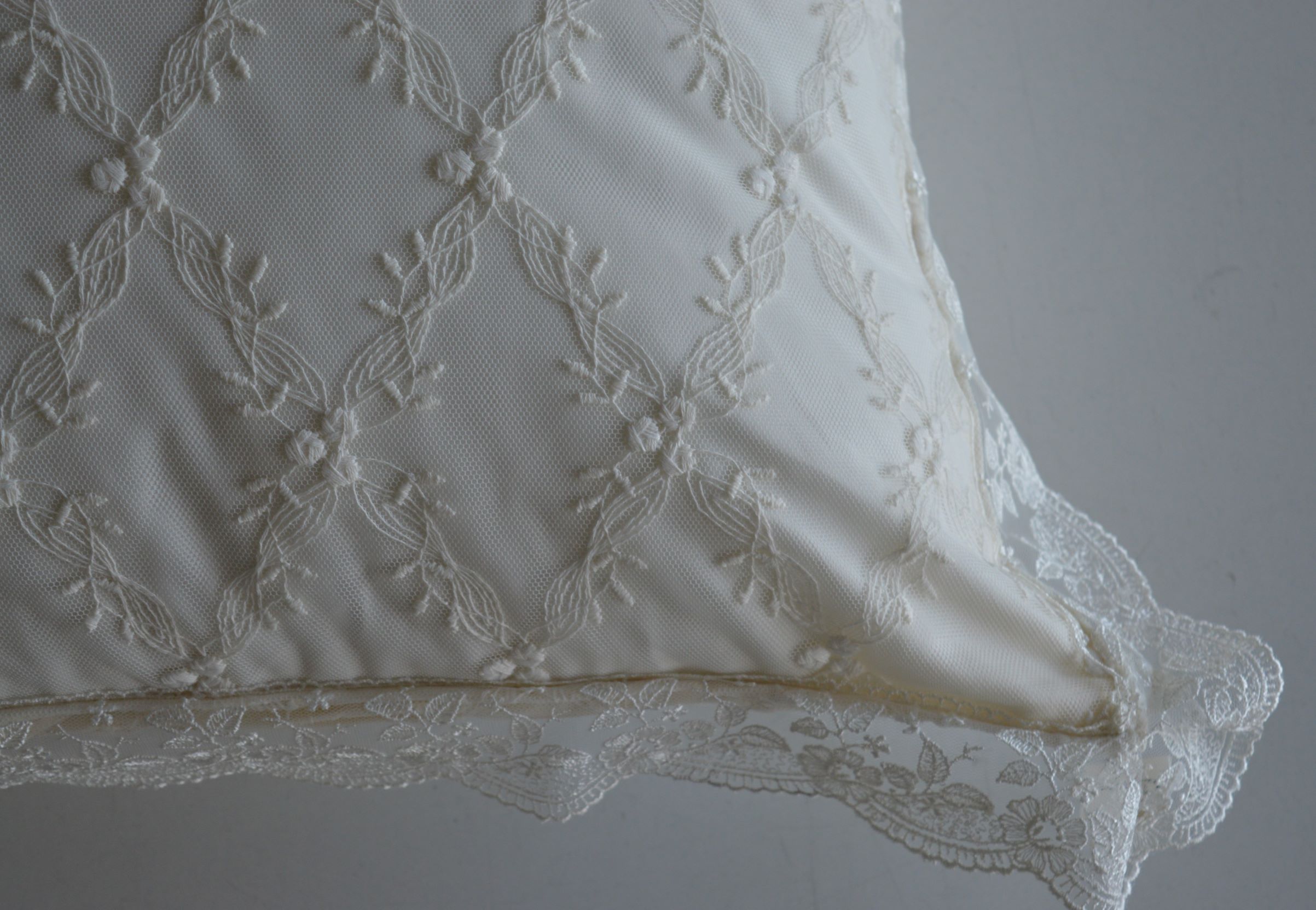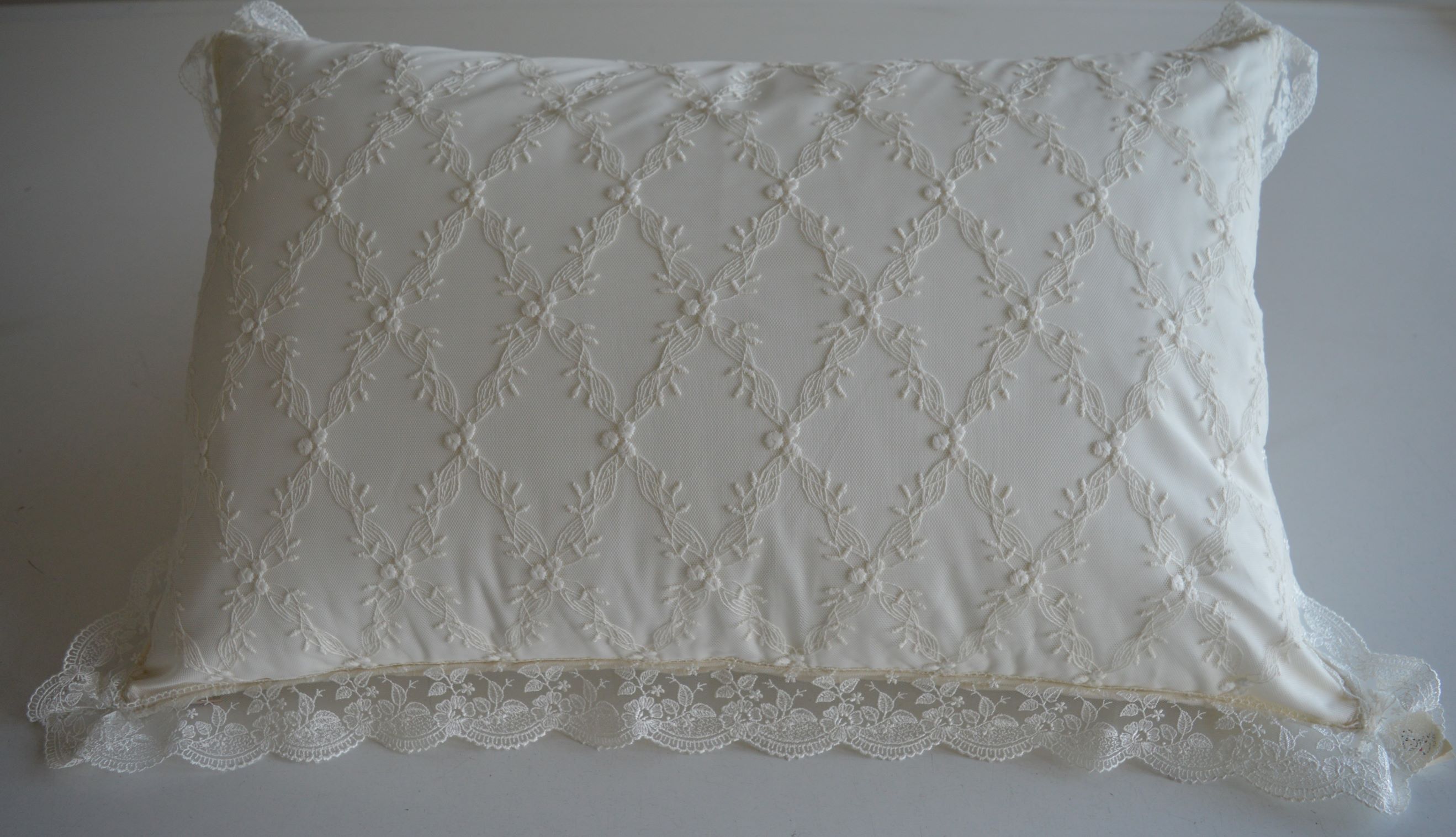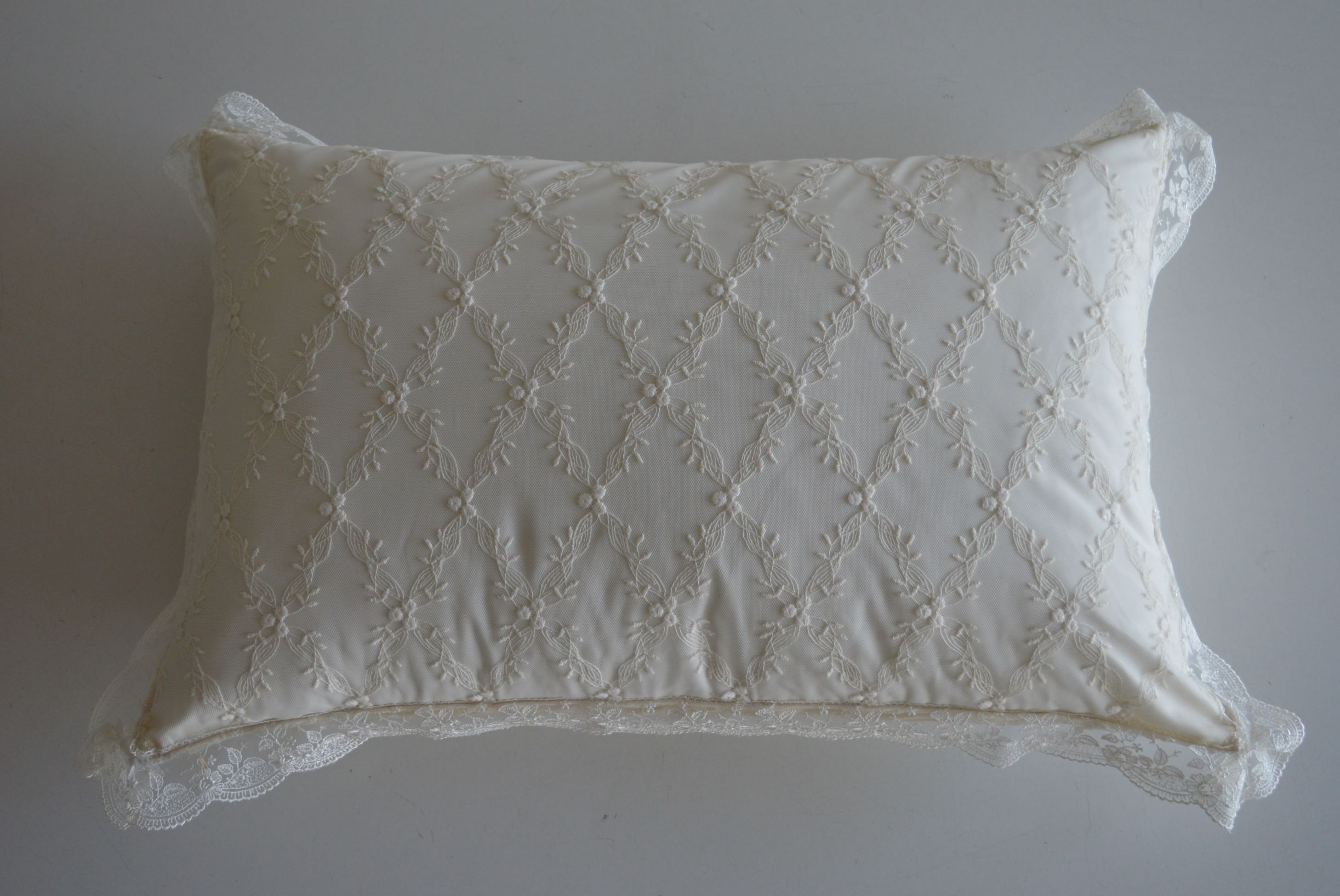 coppia cuscini arredo sfoderabile in un pregiatissimo tulle ricamato mis cm 47x70 piu riccio da 5 colore avorio composizione esterno tulle ricamato 100% poliestere imbottitura 100% poliestere anallergico prodotto artigianale di Emy ricami
