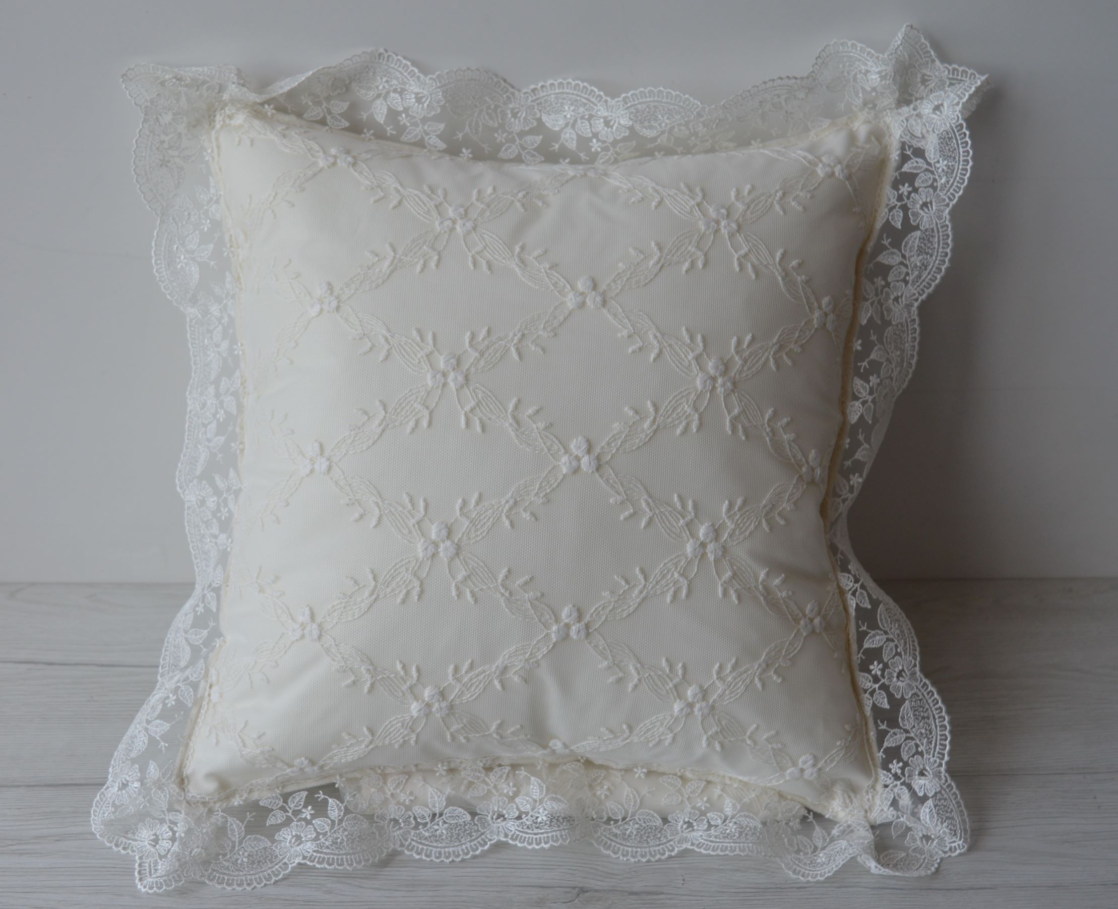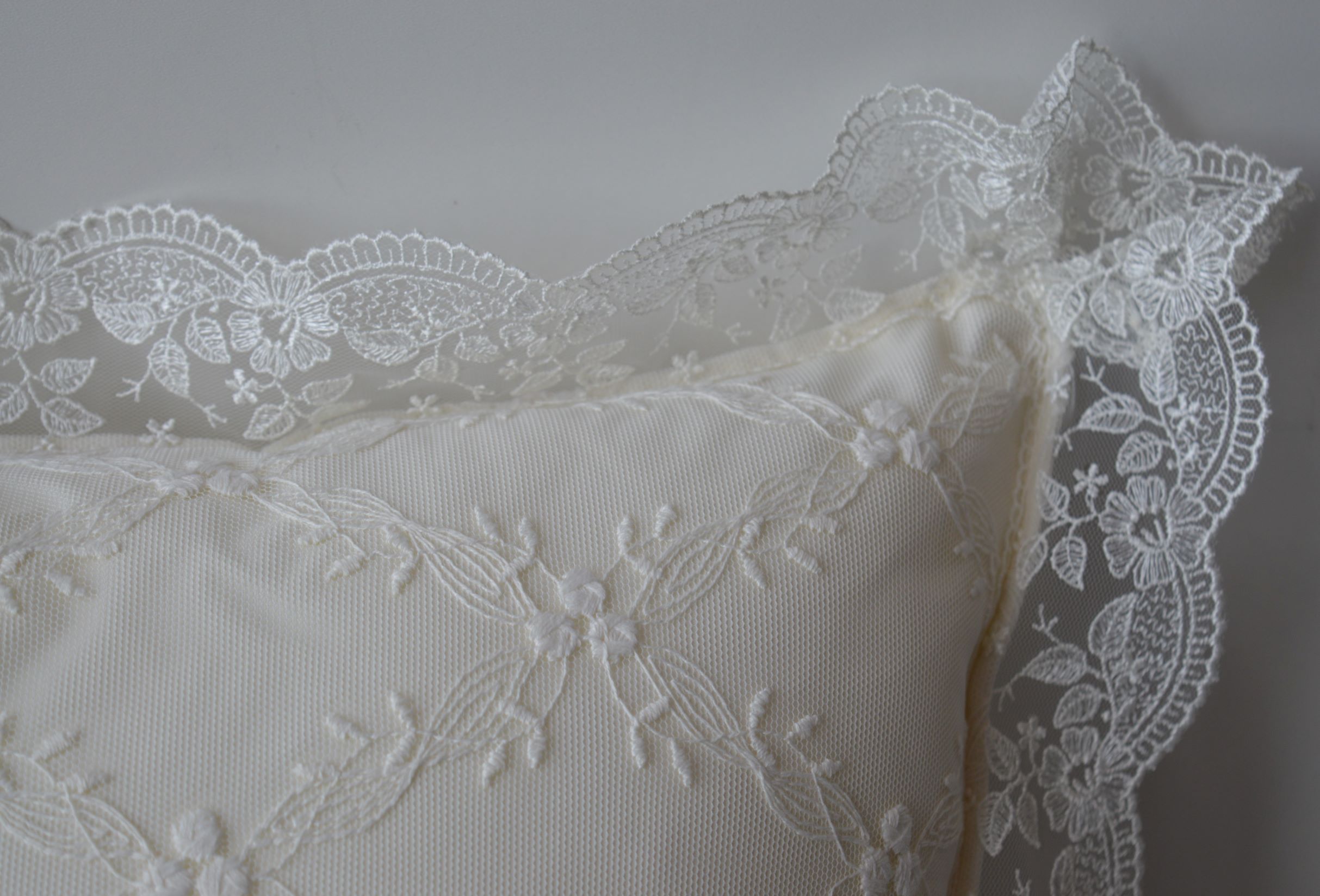coppia cuscini arredo sfoderabile in un pregiatissimo tulle ricamato mis cm 40x40 piu riccio da 5 colore avorio composizione esterno tulle ricamato 100% poliestere imbottitura 100% poliestere anallergico prodotto artigianale di Emy ricami