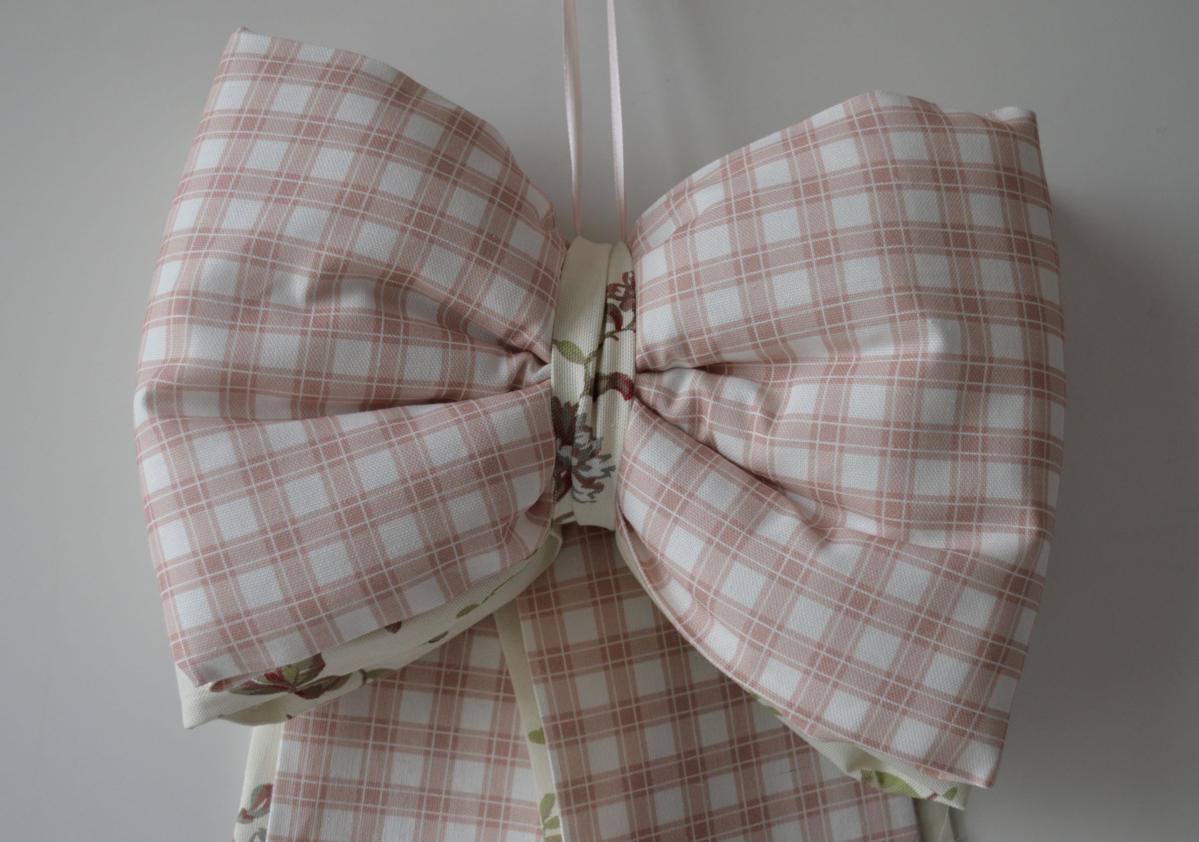 Doppio fiocco imbottito artigianale di Emy ricami misura largo cm 30 alto cm 55 x13 di spessore composizione esterno100 cotone imbottitura 100% poliestere antiallergico colore avorio con quadri rosa e fantasia multicolore