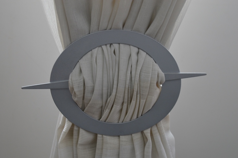 ELEGANTISSIMO FERMATENDA IN ALLUMINIO VERNICIATO COLORE GRIGIO SATINATO DIMENSIONI CM 20X16 CON INTRAMEZZO A PUNTA DI DIMENSIONI CM 28X1,5 ADATTO A TUTTI I TIPI DI TENDAGGI NON DI GROSSE DIMENSIONI.