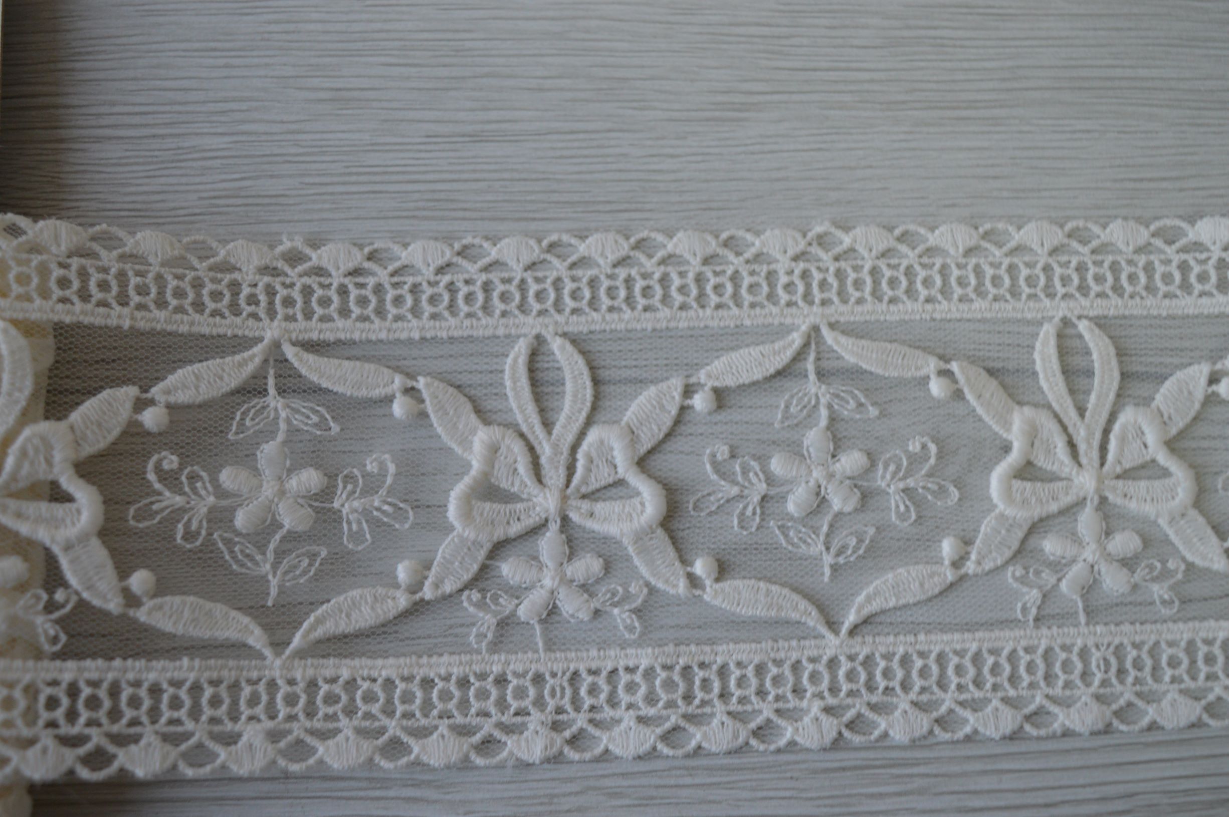 pregiatissimo pizzo macrame su base di tulle colore avorio alto cm 8 composizione 100% poliestere il prezzo si intende a mt lineari