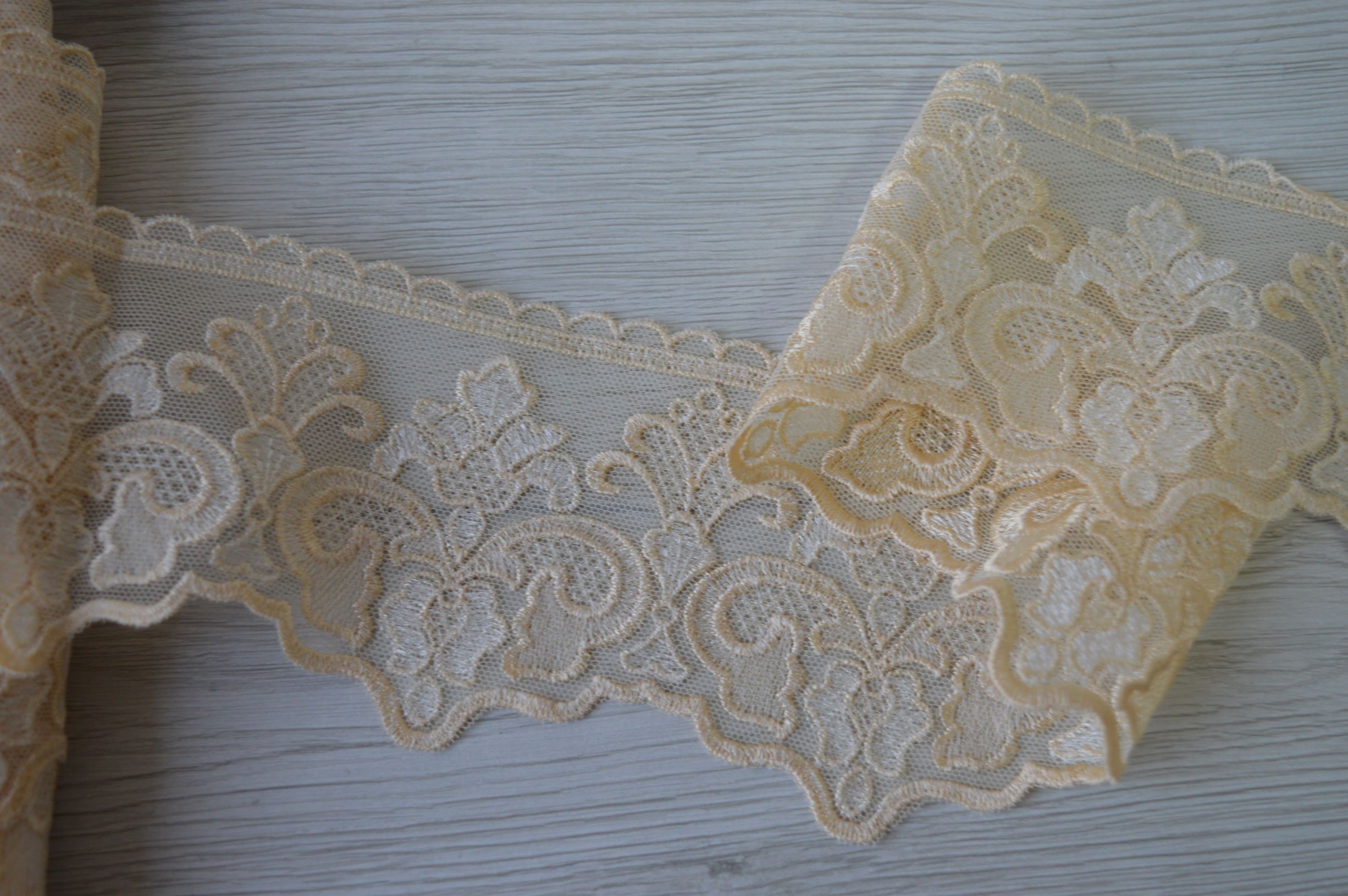 pregiatissimo finale di tulle ricamato colore beige e avorio alto cm 9 composizione 100% poliestere il prezzo si intende a mt lineari