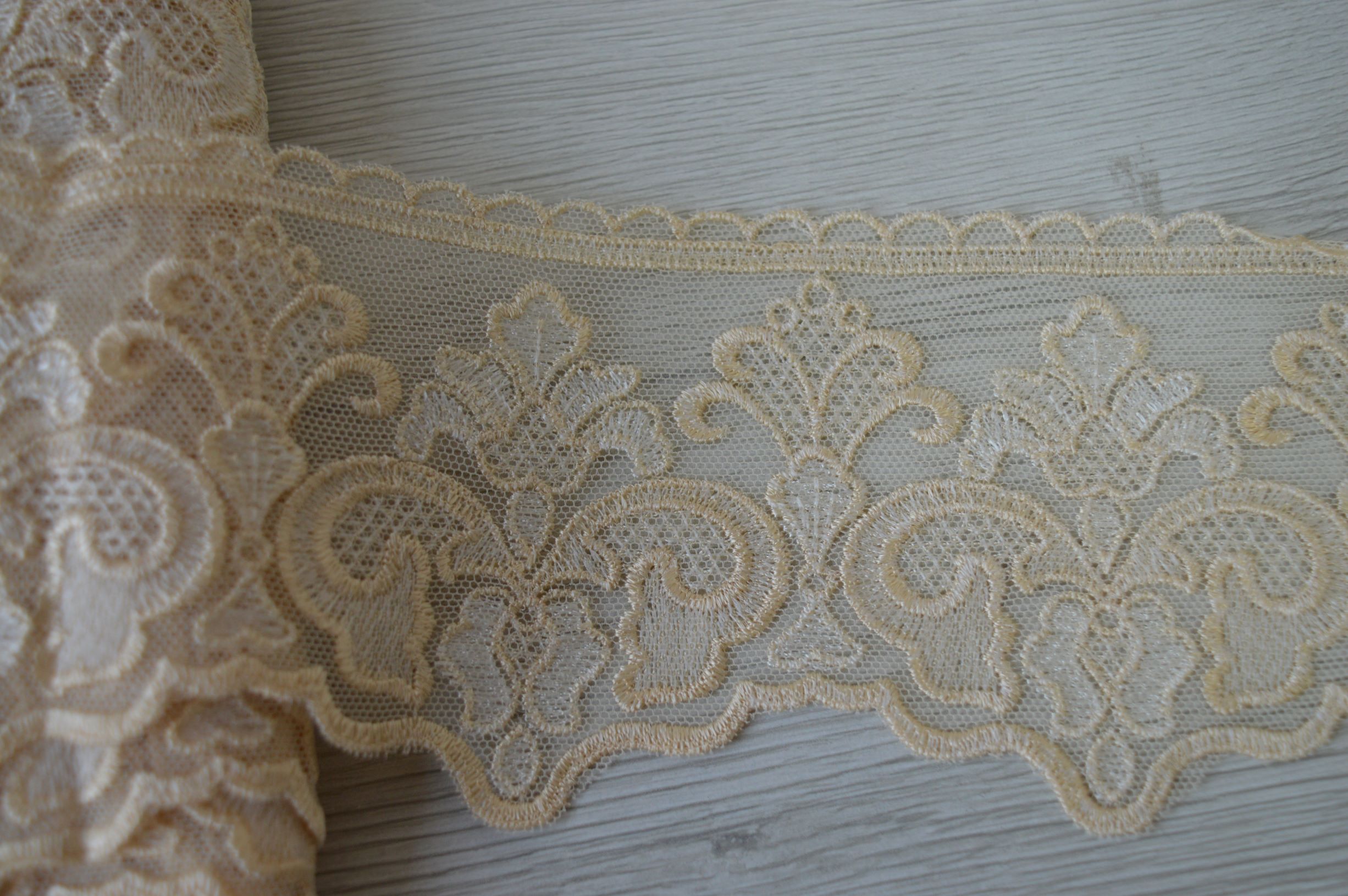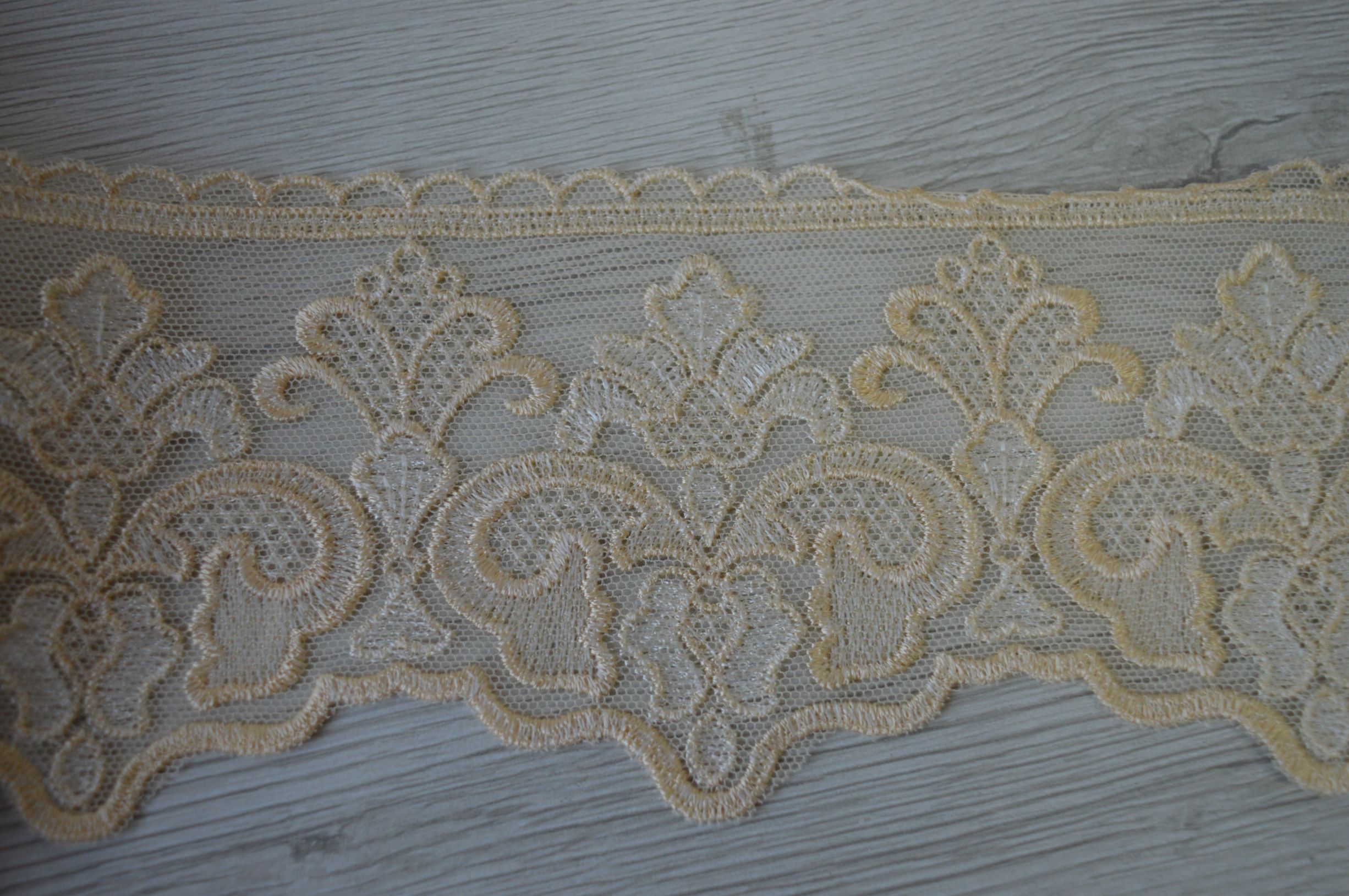 pregiatissimo finale di tulle ricamato colore beige e avorio alto cm 9 composizione 100% poliestere il prezzo si intende a mt lineari