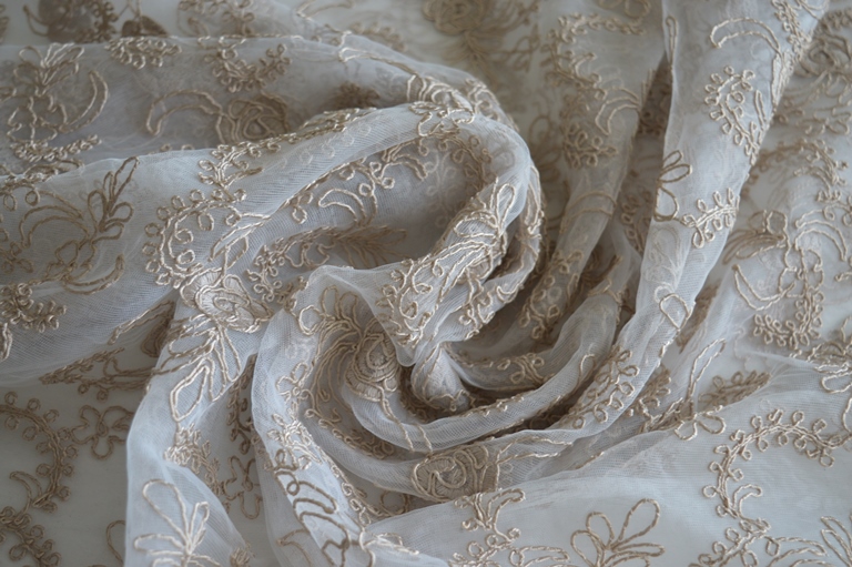 taglio tenda in rebrodè largo mt 3,00x 2,65 alto composizione 100% poliestrere tessuto in tulle con ricami in rebrodè smerlato sotto ricamo rebrodè arriva fino a mt 2,45 di altezza colore tortora