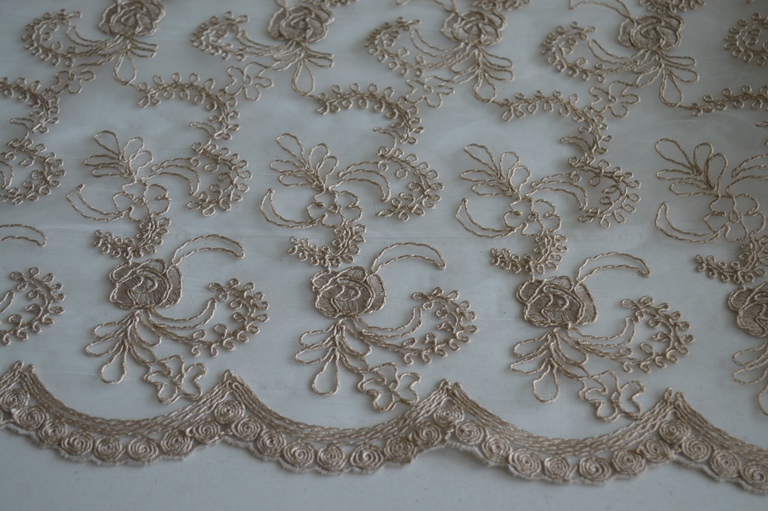 taglio tenda in rebrodè largo mt 3,00x 2,65 alto composizione 100% poliestrere tessuto in tulle con ricami in rebrodè smerlato sotto ricamo rebrodè arriva fino a mt 2,45 di altezza colore tortora