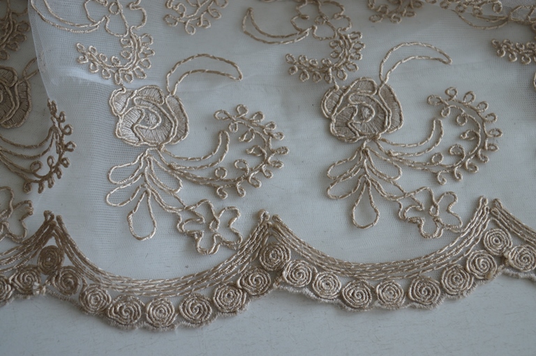taglio tenda in rebrodè largo mt 3,00x 2,65 alto composizione 100% poliestrere tessuto in tulle con ricami in rebrodè smerlato sotto ricamo rebrodè arriva fino a mt 2,45 di altezza colore tortora