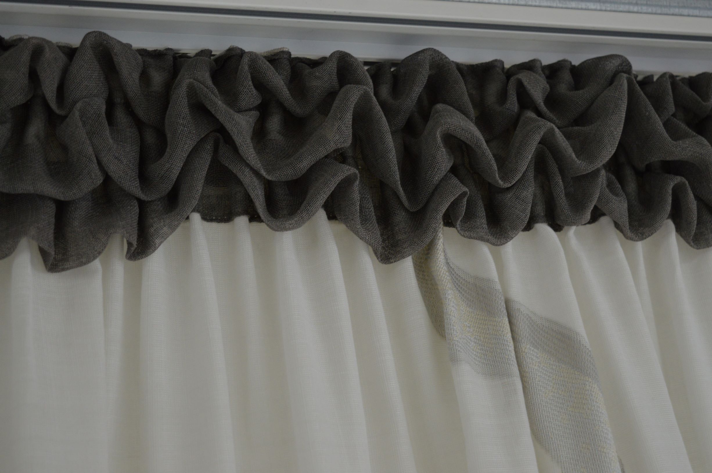 Tenda Sartoriale fantasia e tinta unita fondo naturale con fantasia grigio e tortora sopra e laterale tinta unita grigio scuro sistema sbruffetto composizione 100% poliestere Produzione made in Italy. La tenda è già pronta da appendere con gancetti proboscide adatta a qualsiasi misura che rientra in una larghezza min cm160 max 230 altezza cm 285 adattabile a qualsiasi bastone.