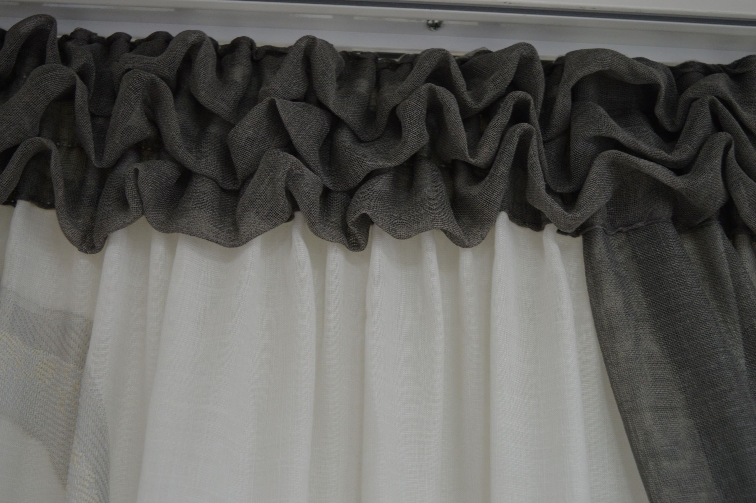Tenda Sartoriale fantasia e tinta unita fondo naturale con fantasia grigio e tortora sopra e laterale tinta unita grigio scuro sistema sbruffetto composizione 100% poliestere Produzione made in Italy. La tenda è già pronta da appendere con gancetti proboscide adatta a qualsiasi misura che rientra in una larghezza min cm160 max 230 altezza cm 285 adattabile a qualsiasi bastone.