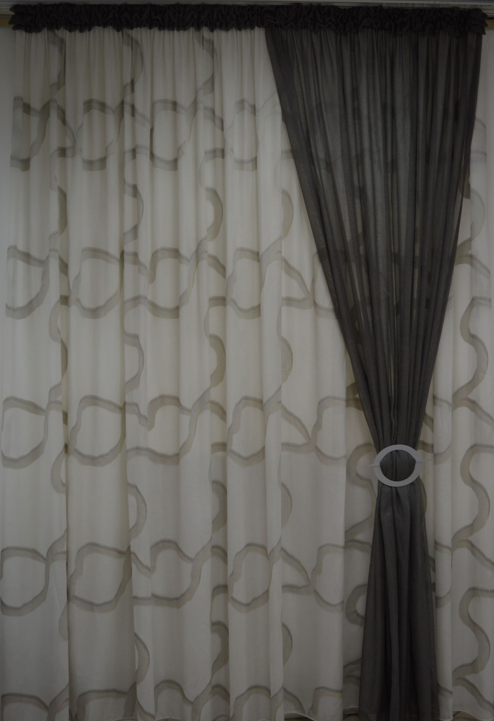 Tenda Sartoriale fantasia e tinta unita fondo naturale con fantasia grigio e tortora sopra e laterale tinta unita grigio scuro sistema sbruffetto composizione 100% poliestere Produzione made in Italy. La tenda è già pronta da appendere con gancetti proboscide adatta a qualsiasi misura che rientra in una larghezza min cm160 max 230 altezza cm 285 adattabile a qualsiasi bastone.