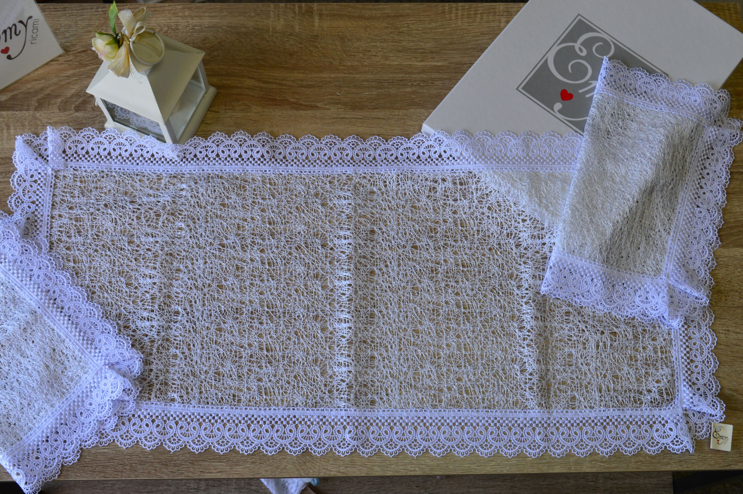 offerta tris centri artigianale di rete e pizzo macrame mis grande 1 pz cm 40x85 mis piccola 2 pz cm 30x40 composizione 100% poliestere bicolore bianco confezionato in una elegante scatola personalizzata emy ricami