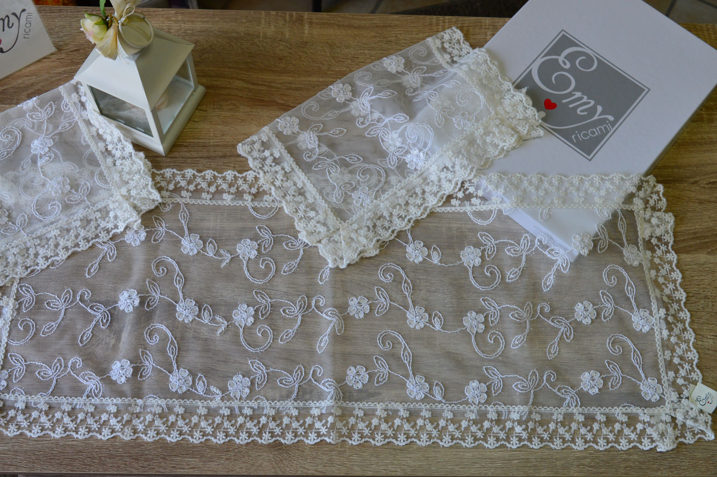 offerta tris centri artigianale di tulle e rebrode mis grande 1 pz cm 33x80 mis piccola 2 pz cm 33x42 composizione 100% poliestere col avorio confezionato in una elegante scatola personalizzata emy ricami