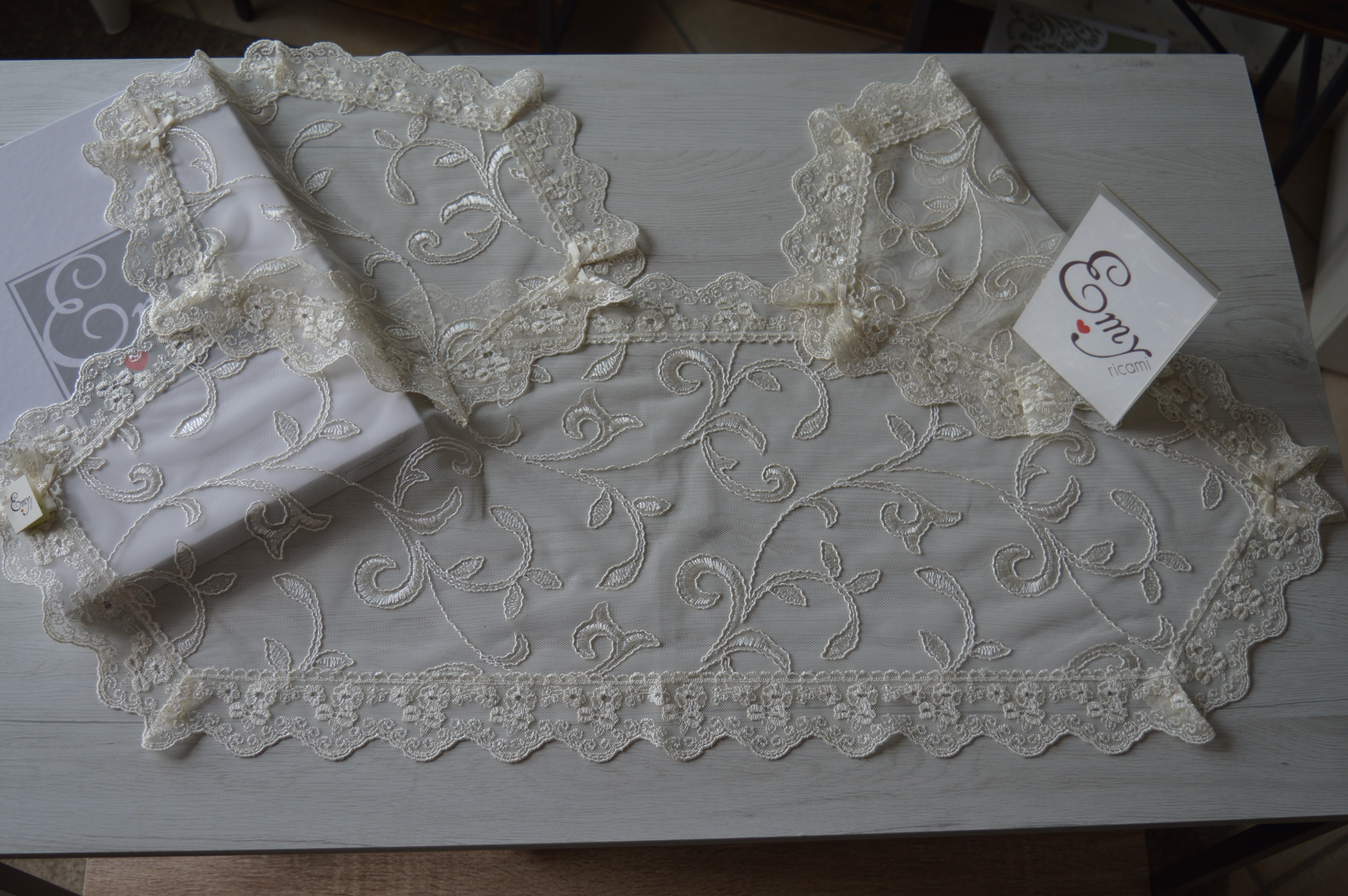 offerta tris centri artigianale di tulle e rebrode mis grande 1 pz cm 35x90 mis piccola 2 pz cm 30x40 composizione 100% poliestere col avorio confezionato in una elegante scatola personalizzata emy ricami