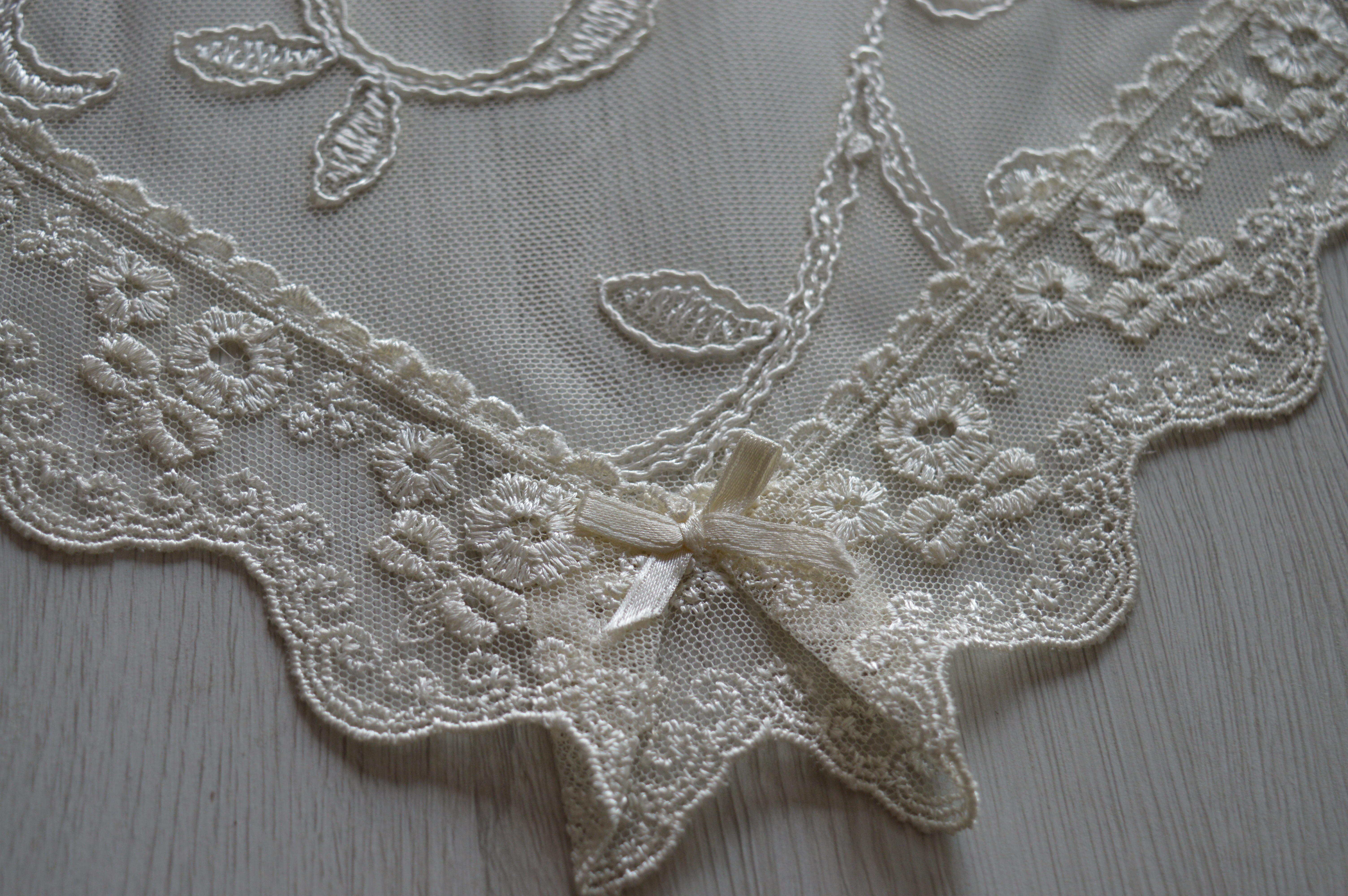 offerta tris centri artigianale di tulle e rebrode mis grande 1 pz cm 35x90 mis piccola 2 pz cm 30x40 composizione 100% poliestere col avorio confezionato in una elegante scatola personalizzata emy ricami