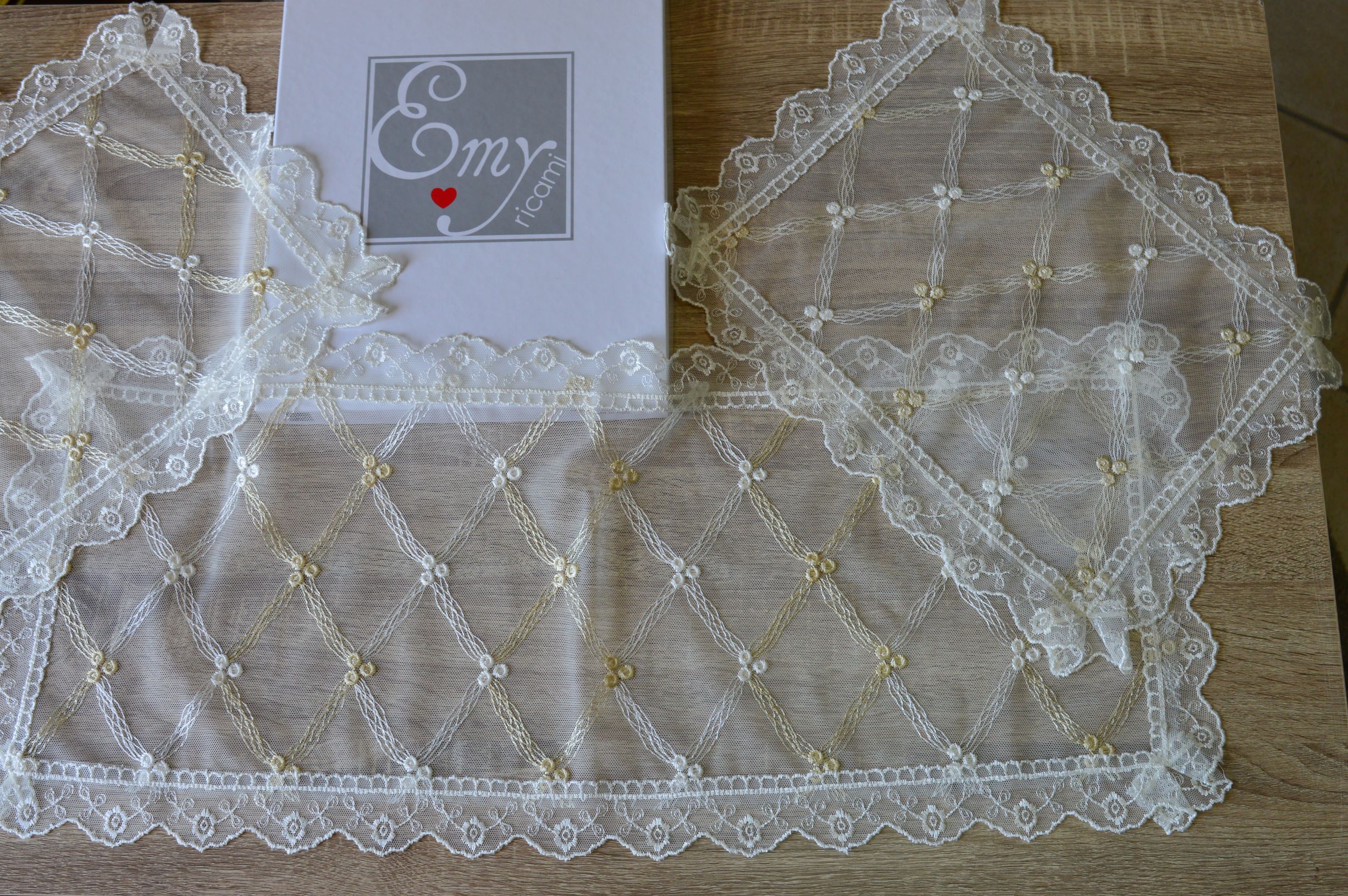 offerta tris centri artigianale di tulle ricamato mis grande 1 pz cm 30x70 mis piccola 2 pz cm 30x40 composizione 100% poliestere bicolore avorio e beige confezionato in una elegante scatola personalizzata emy ricami