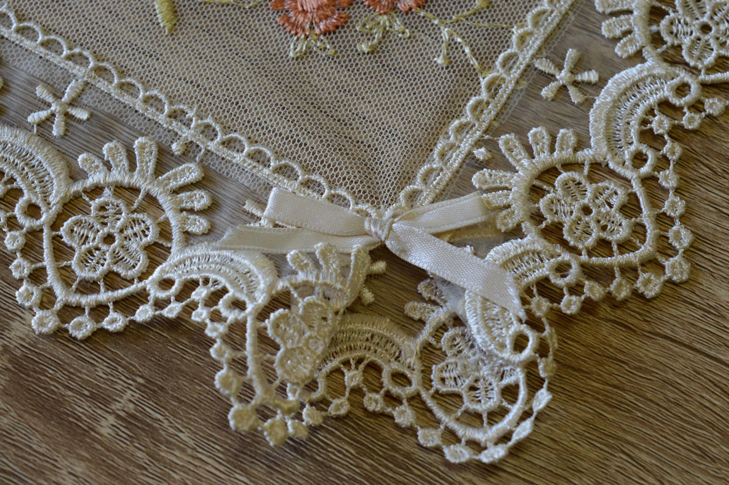 offerta tris centri artigianale di tulle ricamato mis grande 1 pz cm 35x90 mis piccola 2 pz cm 35x45 composizione 100% poliestere bicolore beige e rosa confezionato in una elegante scatola personalizzata emy ricami