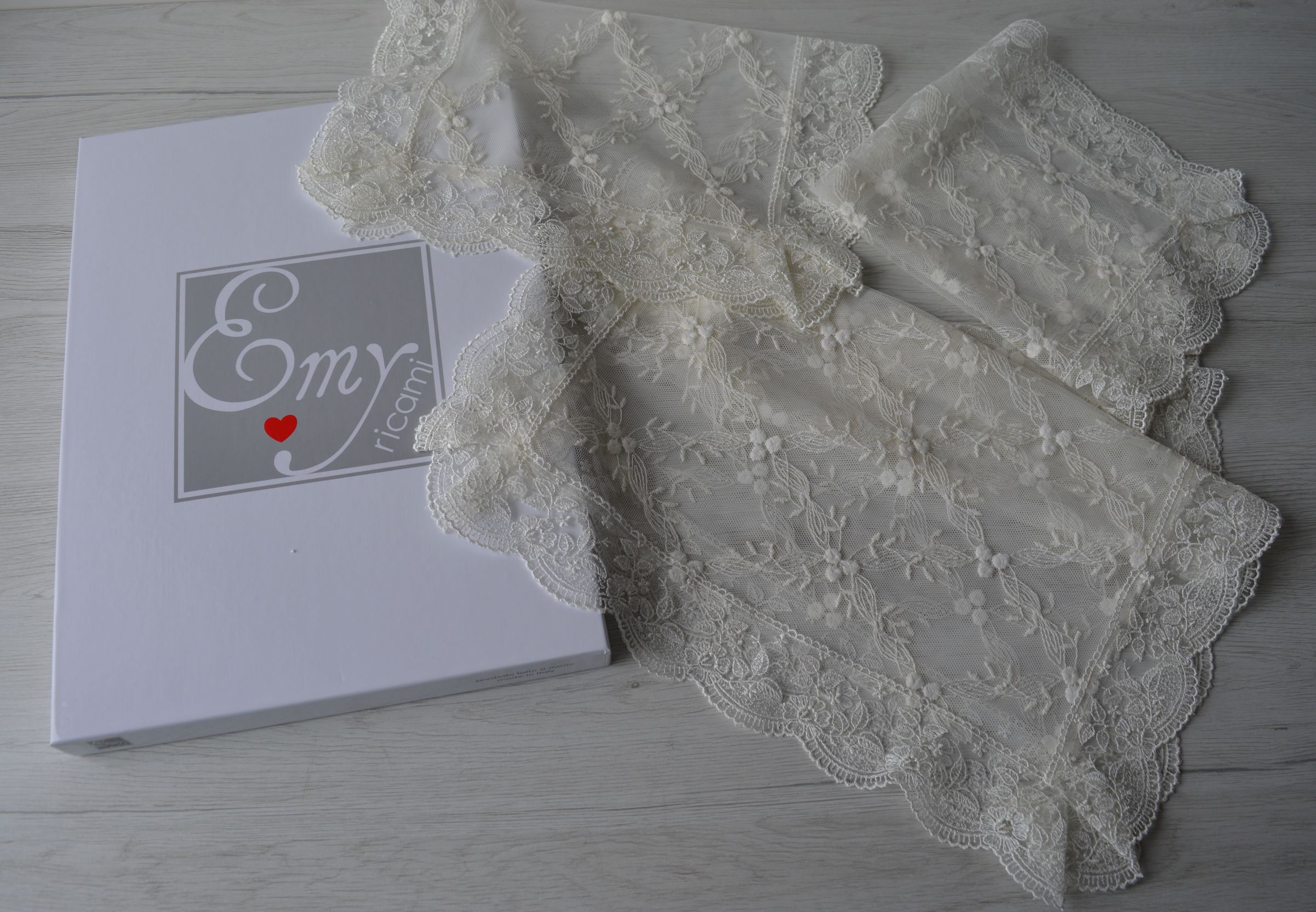 TRIS CETRI IN TULLE RICAMATO 1 PZ MIS GRANDE 40X88 2 PZ MIS PICCOLA 33X45 COMPOSIZIONE 100% POLIESTERE CONFEZIONATO IN UN ELEGANTISSIMA SCATOLA PERSONALIZZATA EMY RICAMI