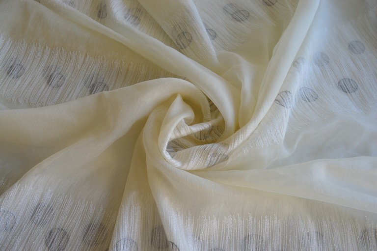TAGLIO TENDA ART. AGATA COLORE: AVORIO CON INSERTI IN ARGENTO A FASCE ORIZZONTALI MISURA: ALTEZZA MT 3.00 X LARGHEZZA MT 6,50 TESSUTO SEMITRASPARENTE SI LA VA E NON SI STIRA