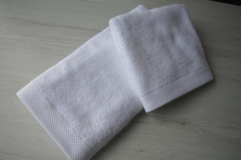 coppia asciugamano grande e piccola colore bianco composizione 100% cotone misura piccola cm 57x38 grande cm 103x56 peso 500gr al mtq rifinita in basso con greca da 3cm