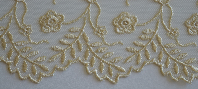 PIZZO TULLE RICAMATO ART. AVIGNONE ALTO : CM 11 COLORE: BEIGE COMPOSIZIONE : BASE TULLE RICAMATO 100% POLIESTERE IL PREZZO E IL QUANTITATIVO SI INTENDE IN MT LINEARI